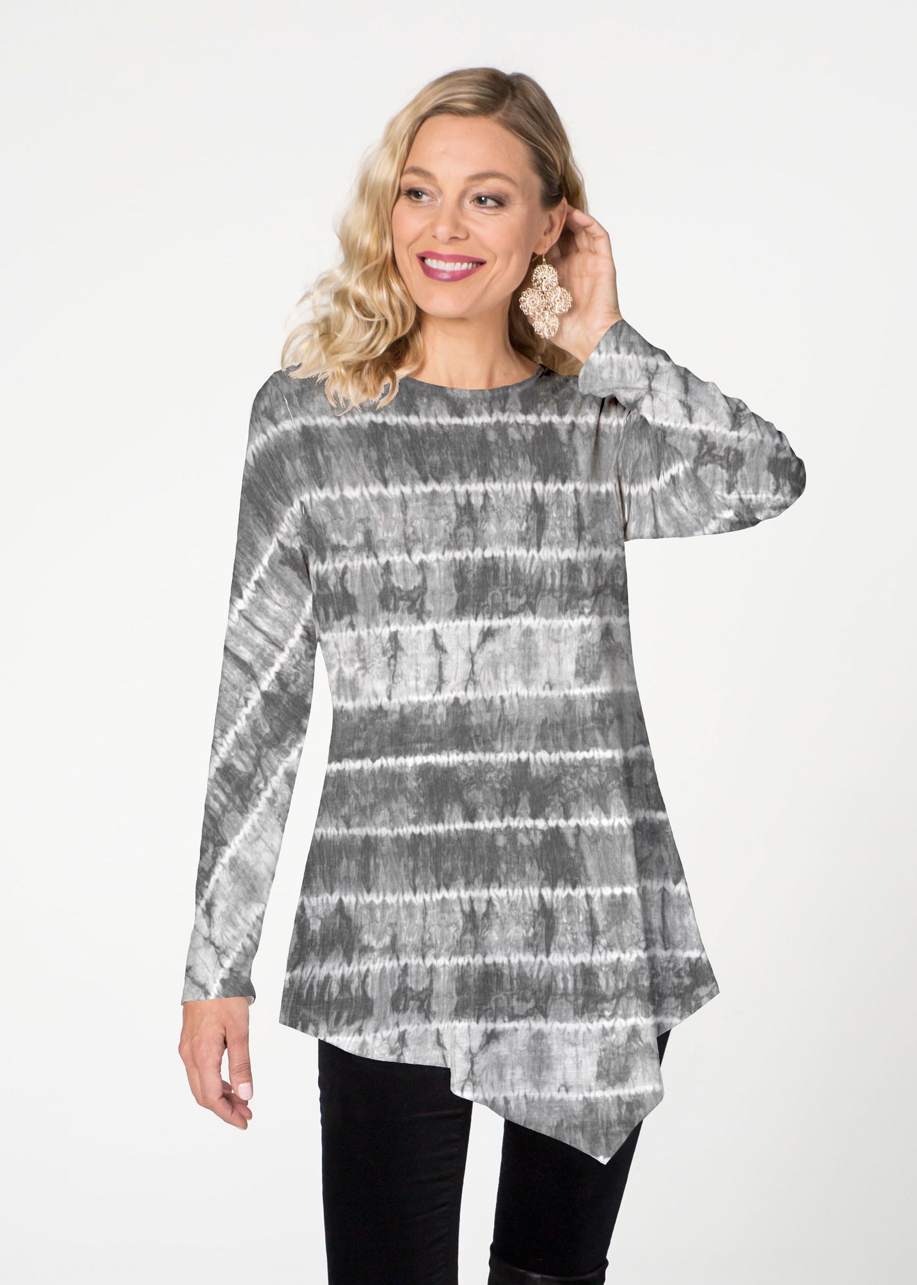 The Asymmetrical French Terry Tunic is soft and lightweight. This Relaxed crew neck features an Asymmetrical hem that falls just below the hip with long sleeves.