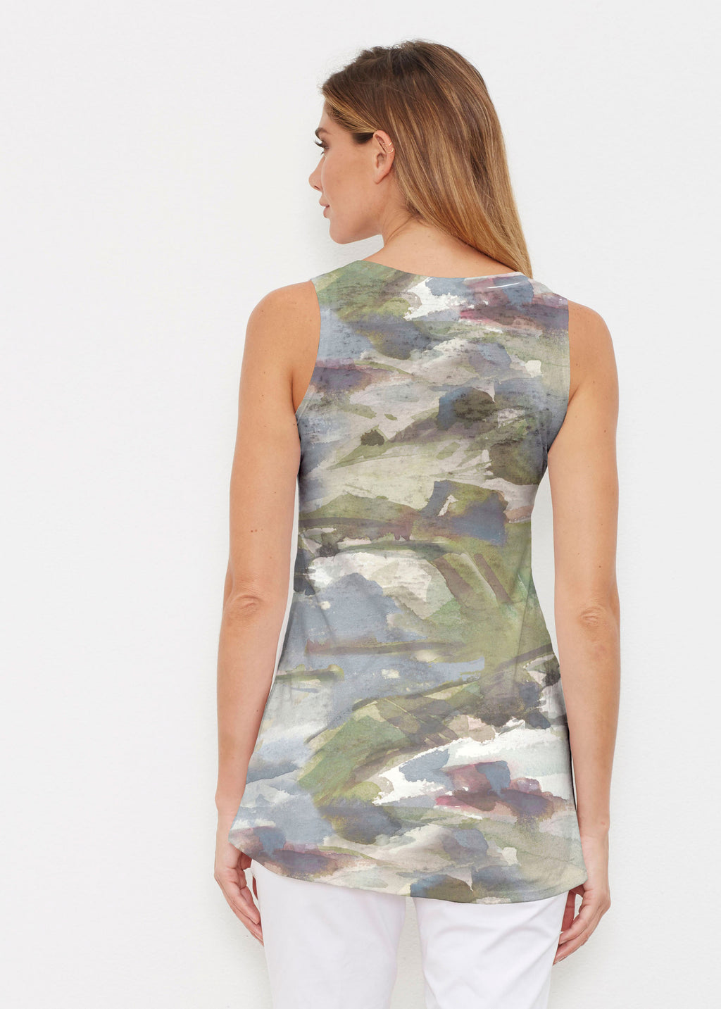 This tank is the perfect combination of an elegant shape with a sporty look. A high-low cascading hemline falls loosely over the hip in our Signature burnout fabric. No sleeves and a shallow scoop neckline give this tank its sporty vibe.