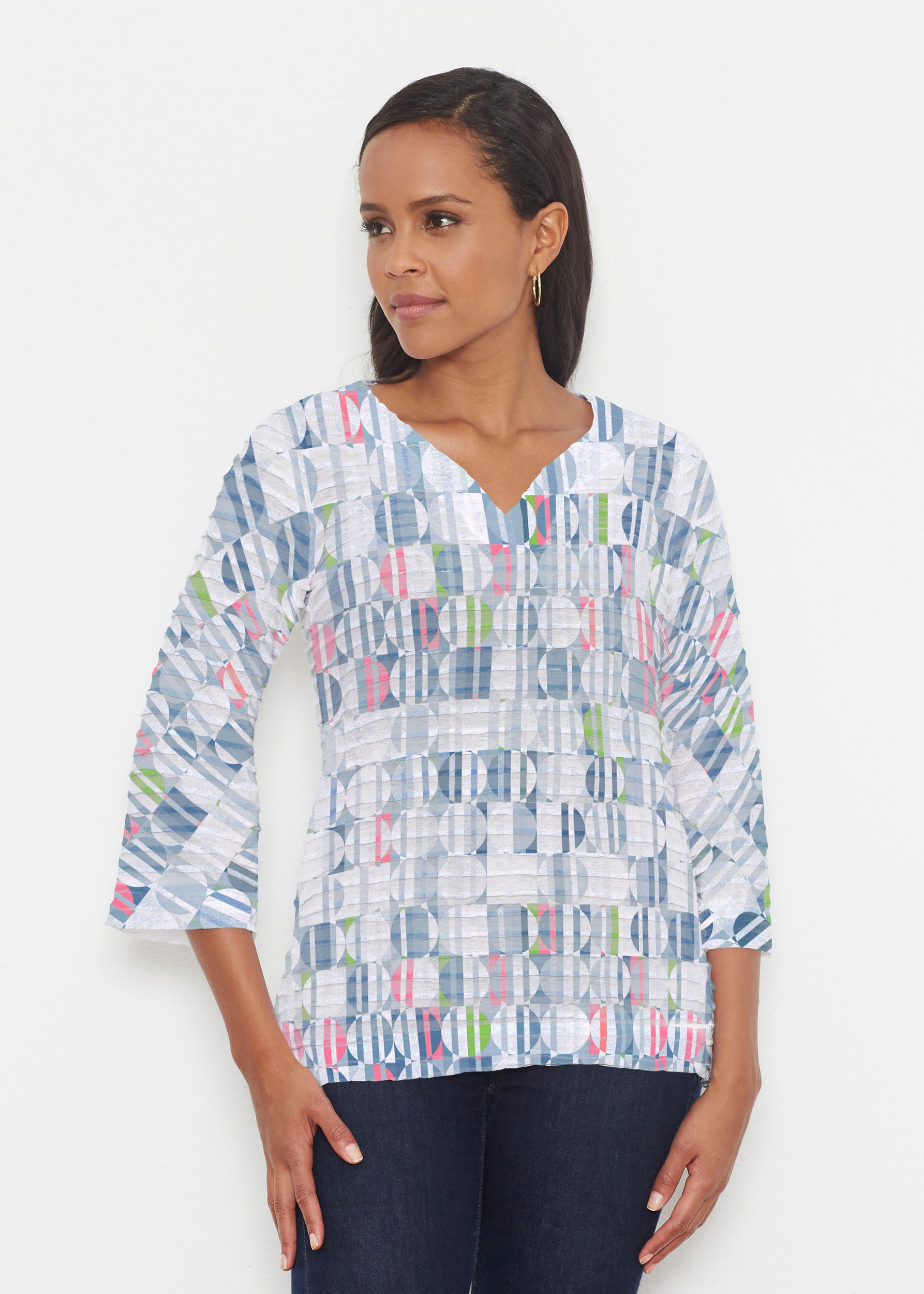 The uniquely soft, pleated texture in this Banded fabric give the 3/4 bell sleeves and sweetheart v-neck a fun and sophisticated look. Flattering side vents adorn the hemline that skims the hip.
