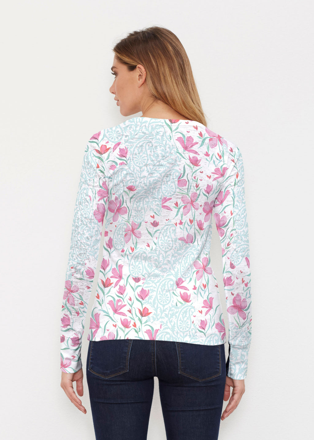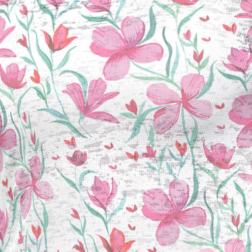 An array of raspberry pink blooming stems with pops of minty green paisley on the back.