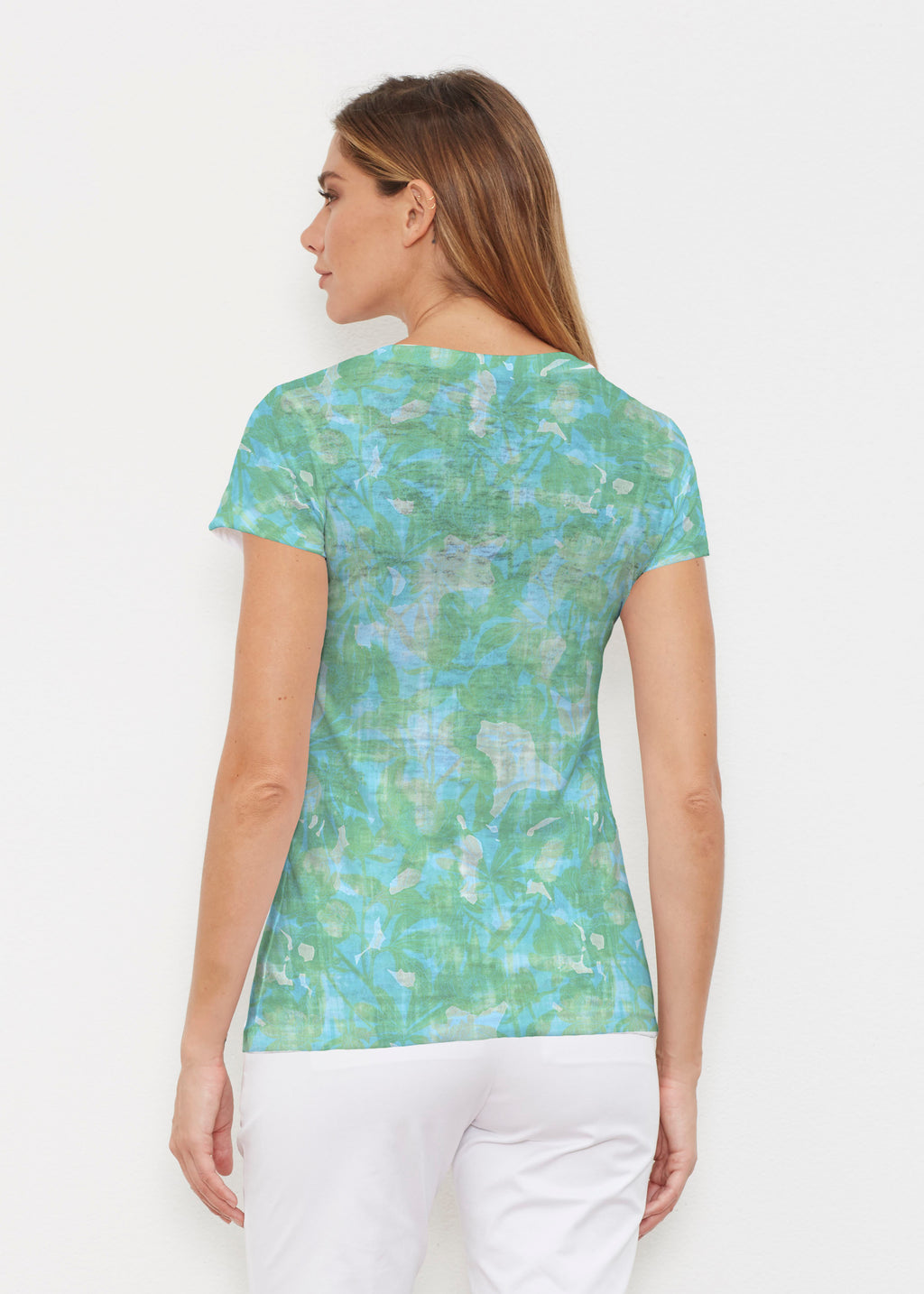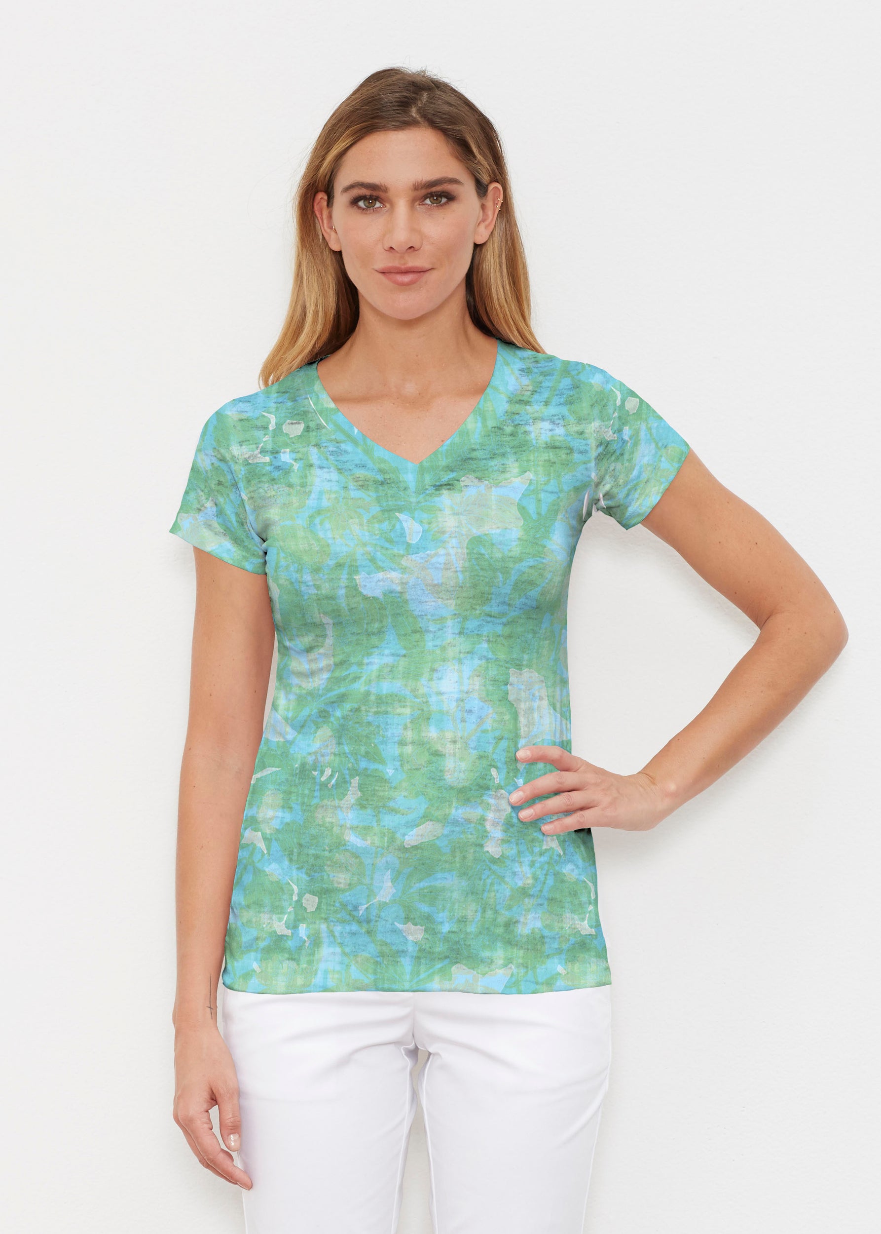 Created in soft, casual burn-out Signature blend, this tee features a subtle v-neck and cap sleeves. -- Your one-of-a-kind garment is created using all-over soft garment sublimation printing. Selected designs are individually printed into your garment. Cotton/Polyester blend.