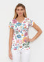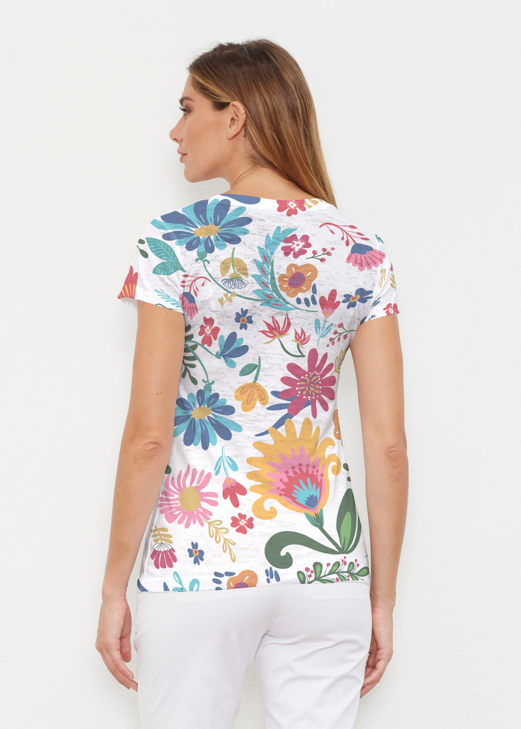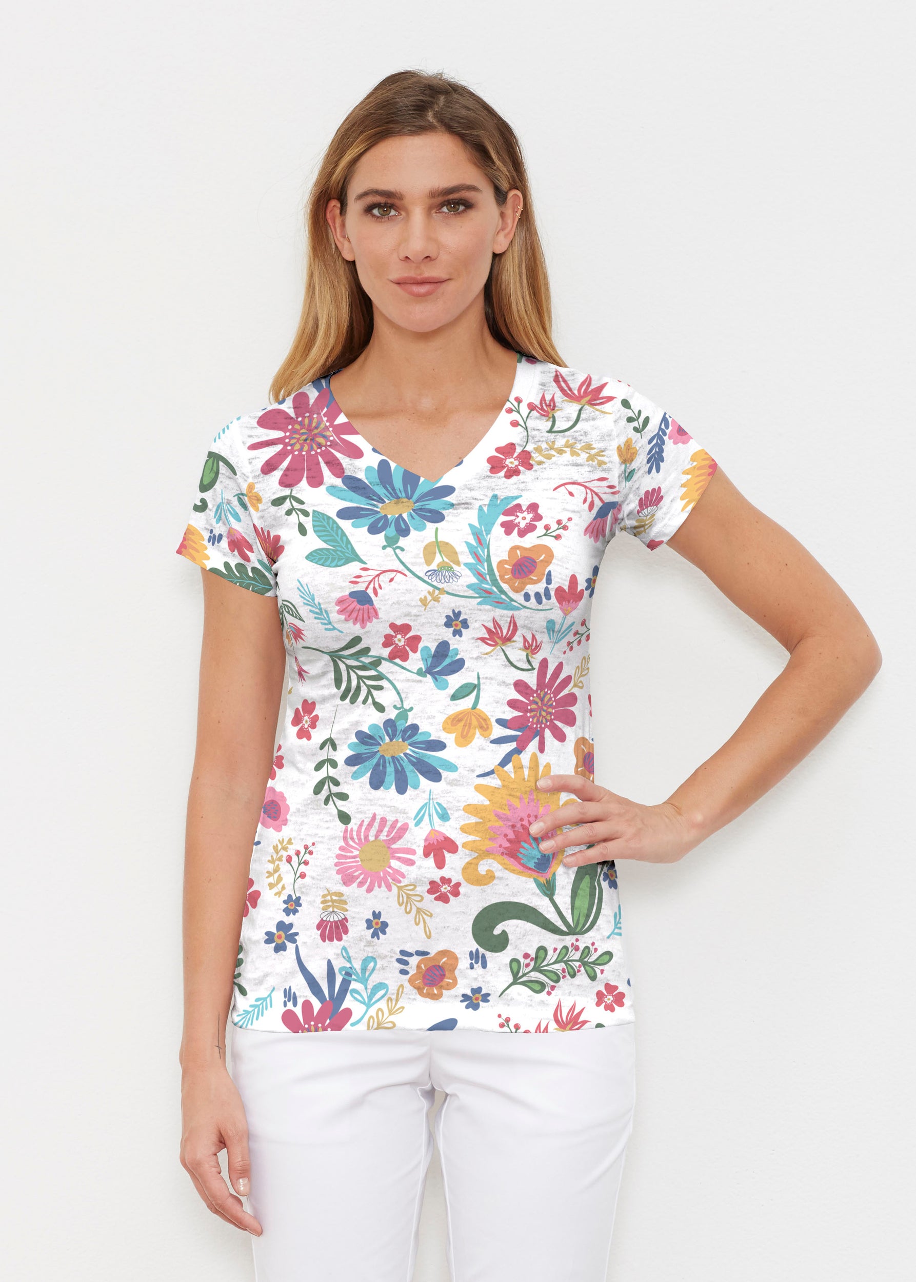 Created in soft, casual burn-out Signature blend, this tee features a subtle v-neck and cap sleeves. -- Your one-of-a-kind garment is created using all-over soft garment sublimation printing. Selected designs are individually printed into your garment. Cotton/Polyester blend.