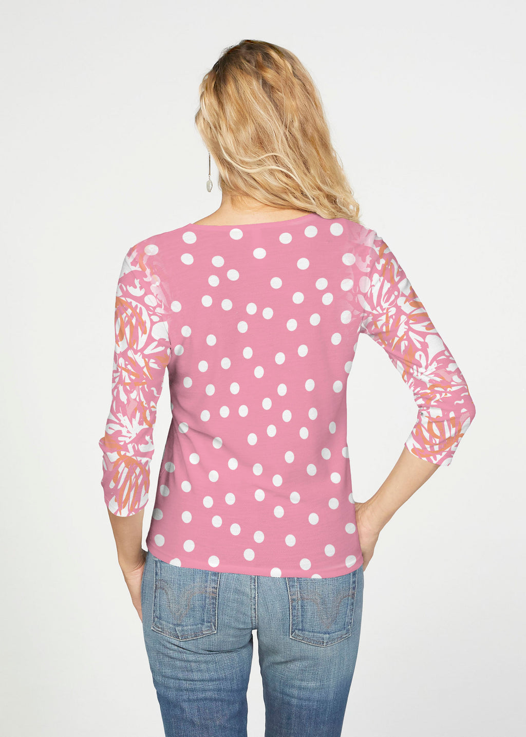 A playful mixture of pinks and oranges makes for a festive twist on traditional camo. Polka dotted back turns this Susan Werner design into summer fun.