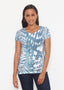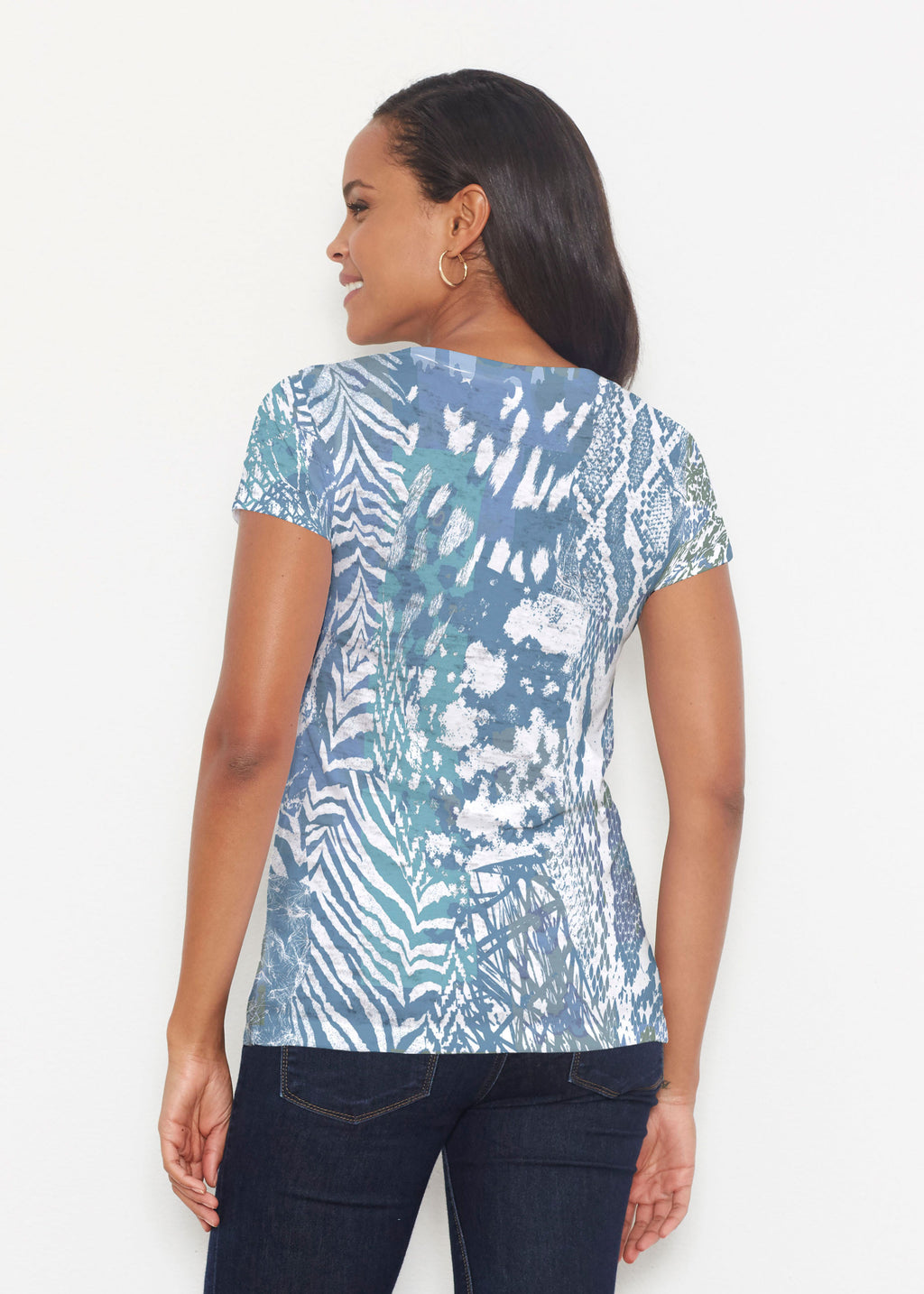 A stunning and sophisticated mixed animal print in beautiful blues and white with a pop of green. Designed by Susan Werner.