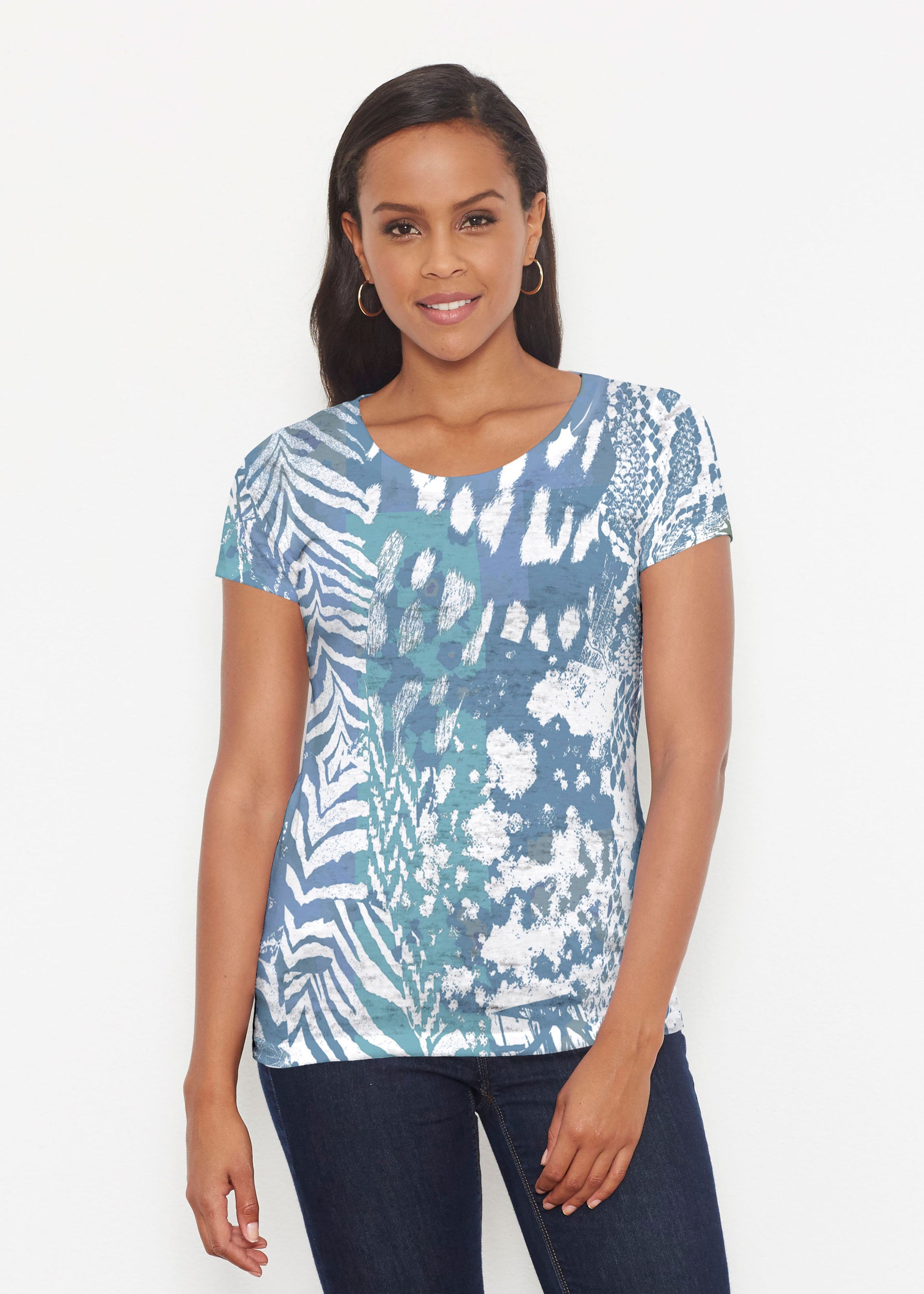 Our scoop neck tee in our casual and supremely soft Signature burnout blend is a best-selling collectible! A relaxed fit falls at the hip.