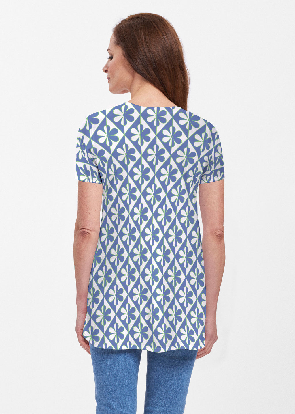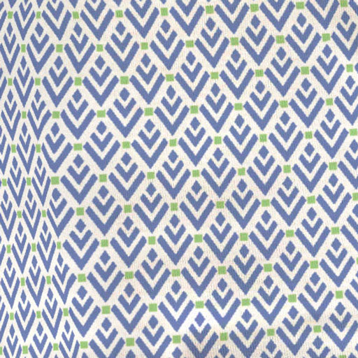 Mixed abstract 60's geo floral print in the back with preppy geo front in delightful blues and green designed by Diane Kappa.