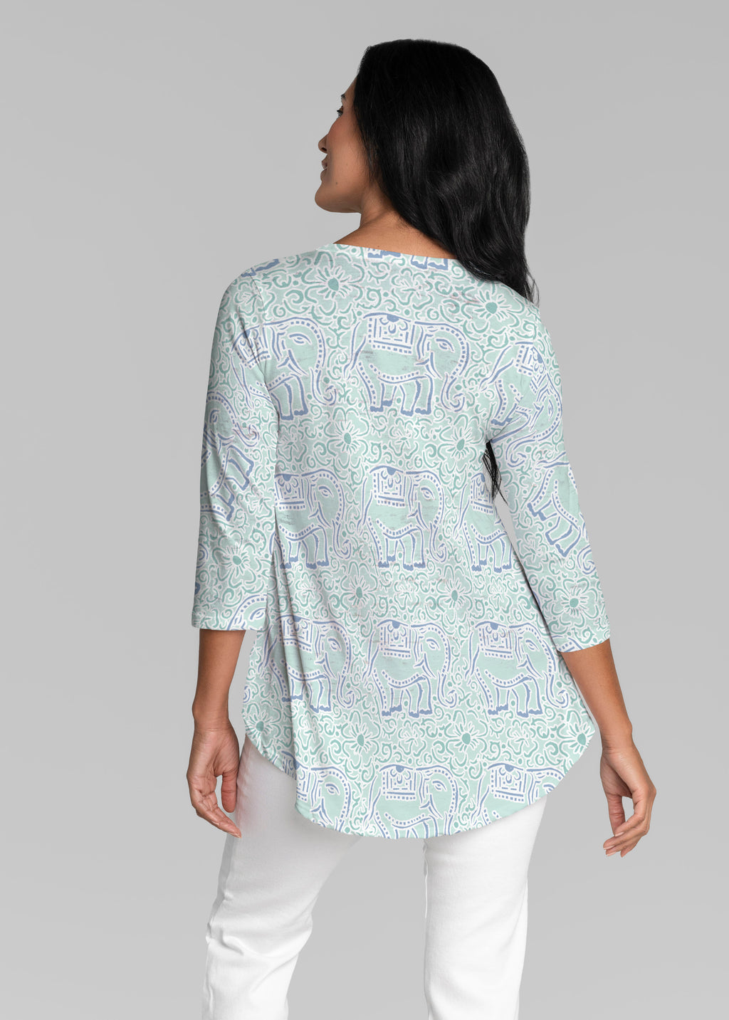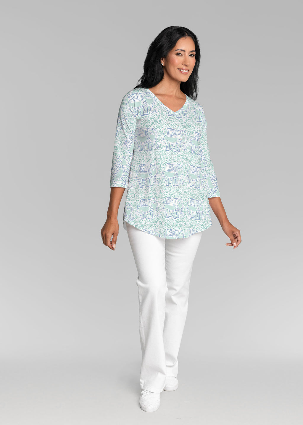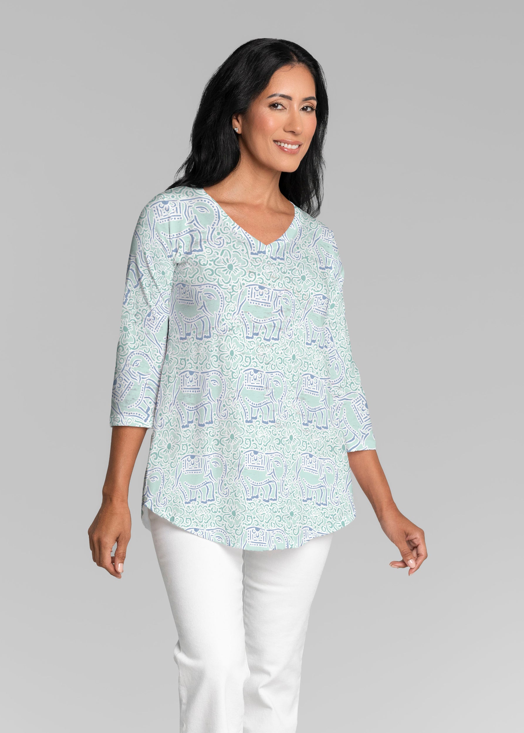 This v-neck tunic in our Signature burnout fabric is forever flattering. 3/4 sleeves and a v-neck flow into a full, swinging shirttail hem.