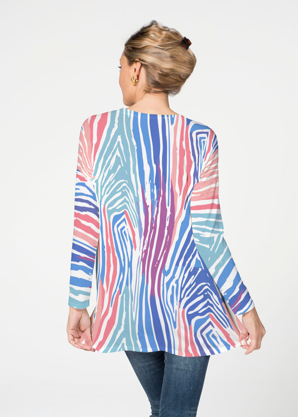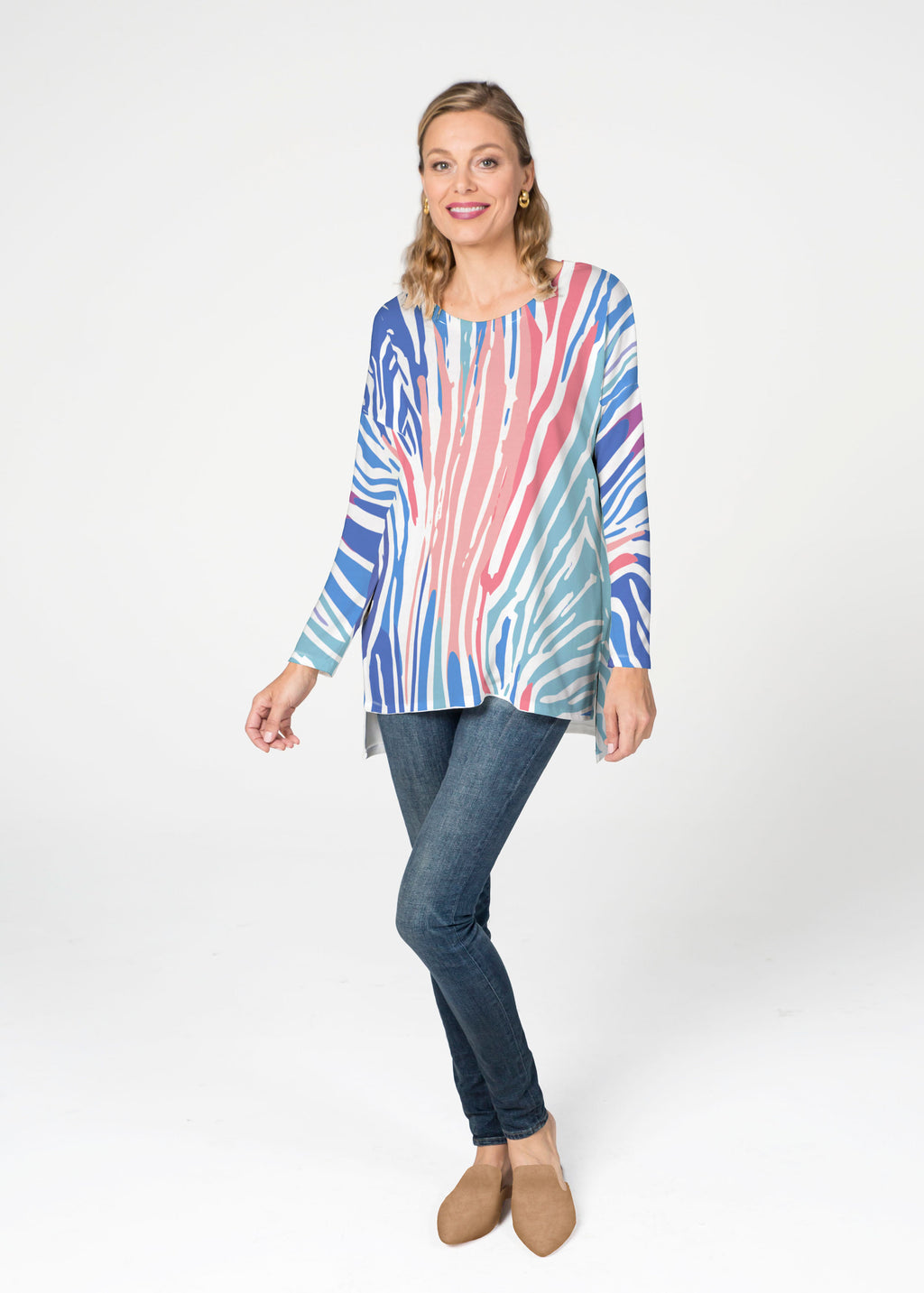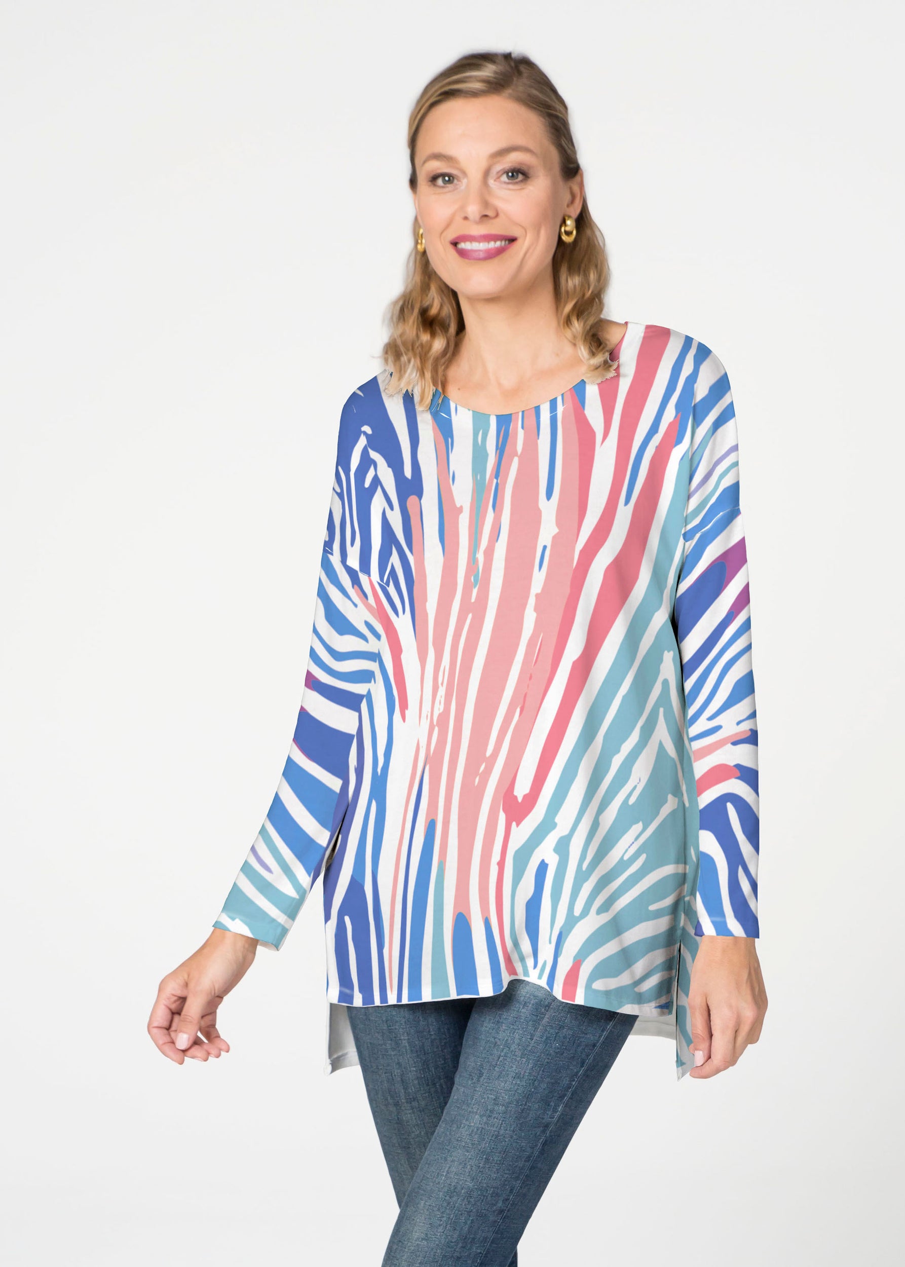 A rainbow of playful stripes in summery colors of corals, purples, aquas & blues.