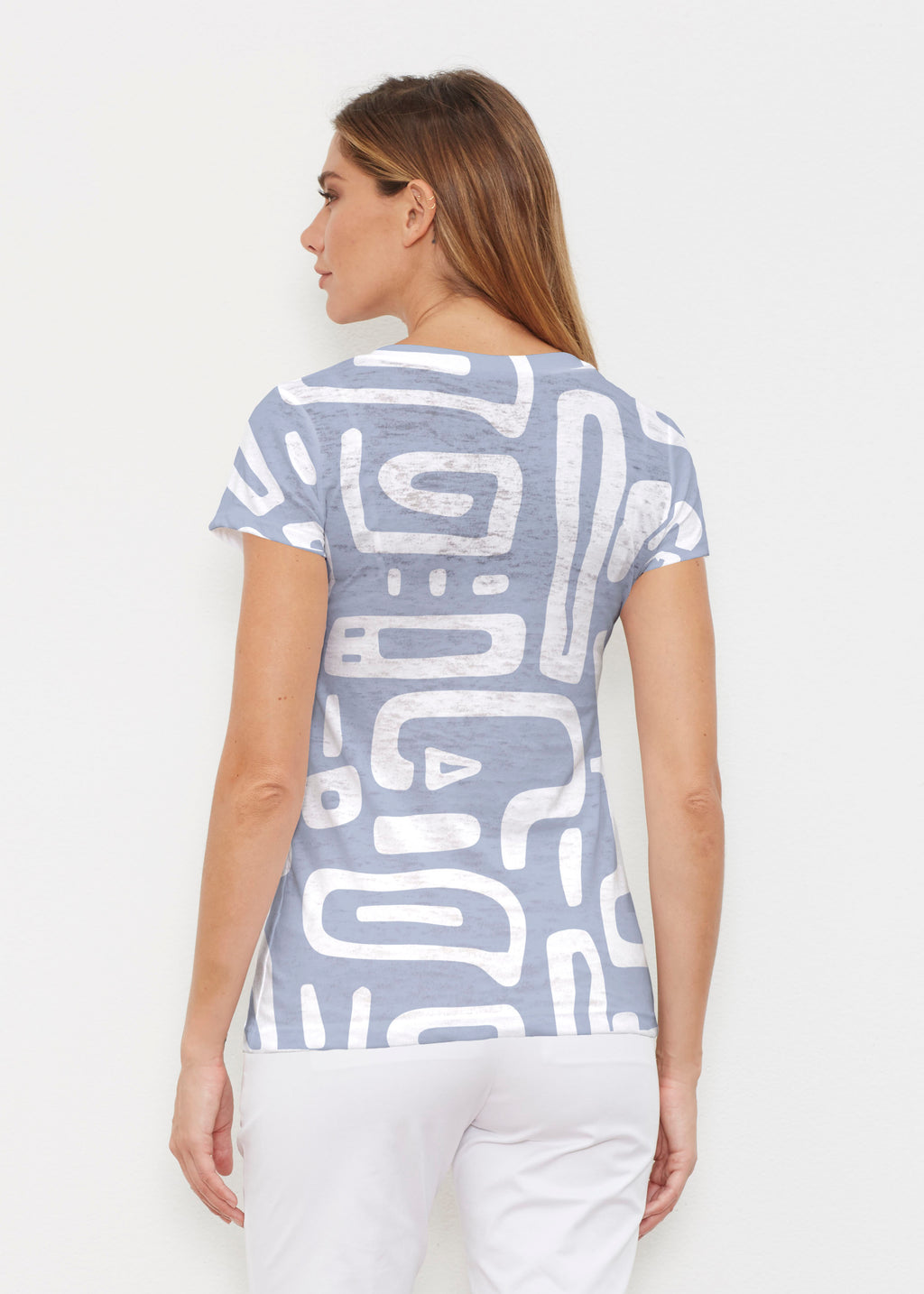 Created in soft, casual burn-out Signature blend, this tee features a subtle v-neck and cap sleeves. -- Your one-of-a-kind garment is created using all-over soft garment sublimation printing. Selected designs are individually printed into your garment. Cotton/Polyester blend.