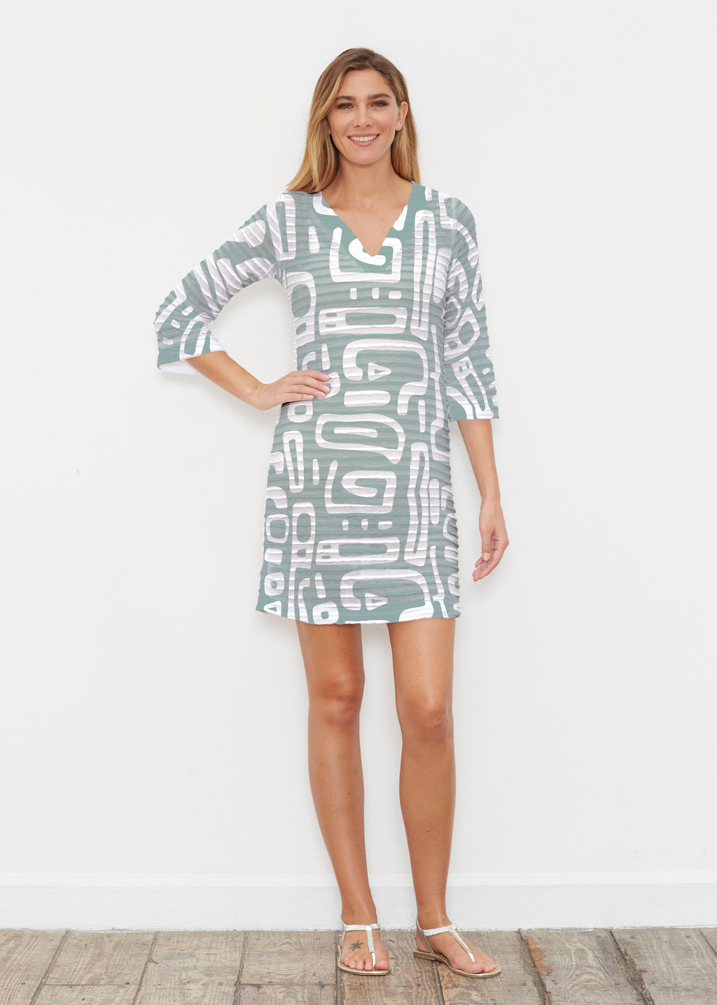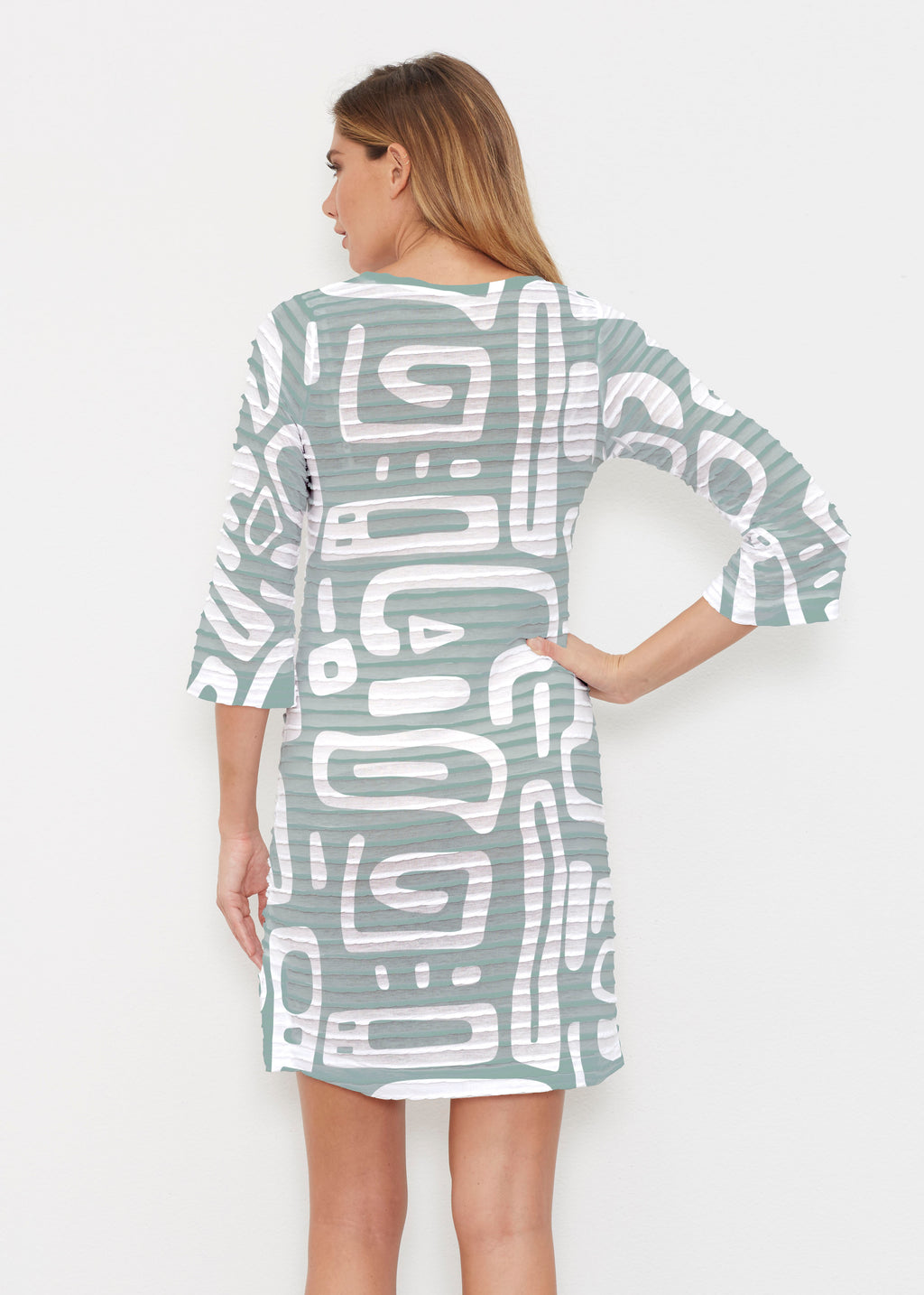 Gentle Geo Green (26055) ~ Banded 3/4 Sleeve Dress
