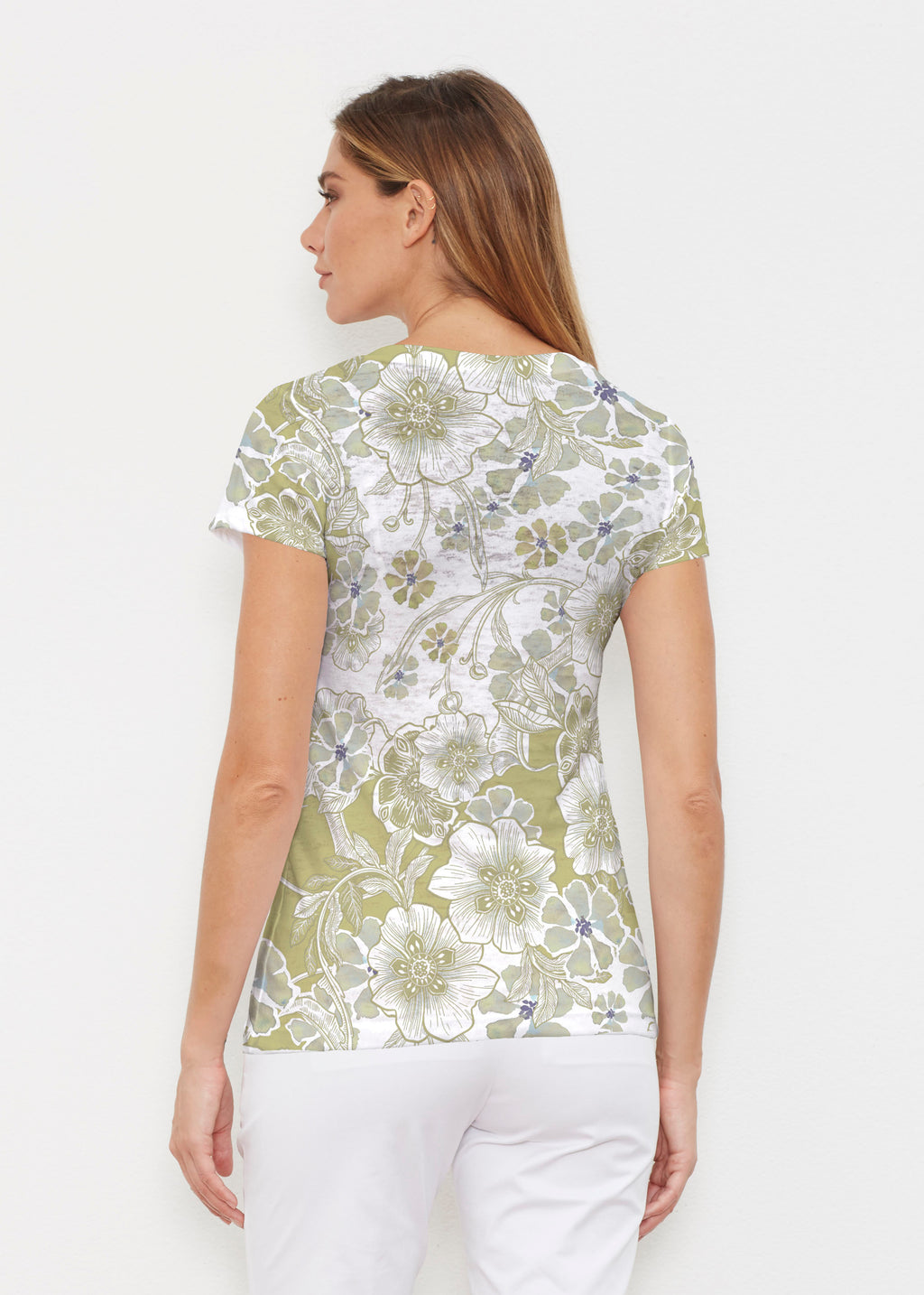 Created in soft, casual burn-out Signature blend, this tee features a subtle v-neck and cap sleeves. -- Your one-of-a-kind garment is created using all-over soft garment sublimation printing. Selected designs are individually printed into your garment. Cotton/Polyester blend.