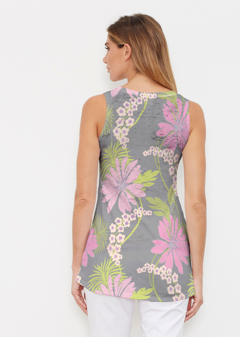 This tank is the perfect combination of an elegant shape with a sporty look. A high-low cascading hemline falls loosely over the hip in our Signature burnout fabric. No sleeves and a shallow scoop neckline give this tank its sporty vibe. -- Your one-of-a-kind garment is created using all-over soft garment sublimation printing. Selected designs are individually printed into your garment. Cotton/Polyester blend.