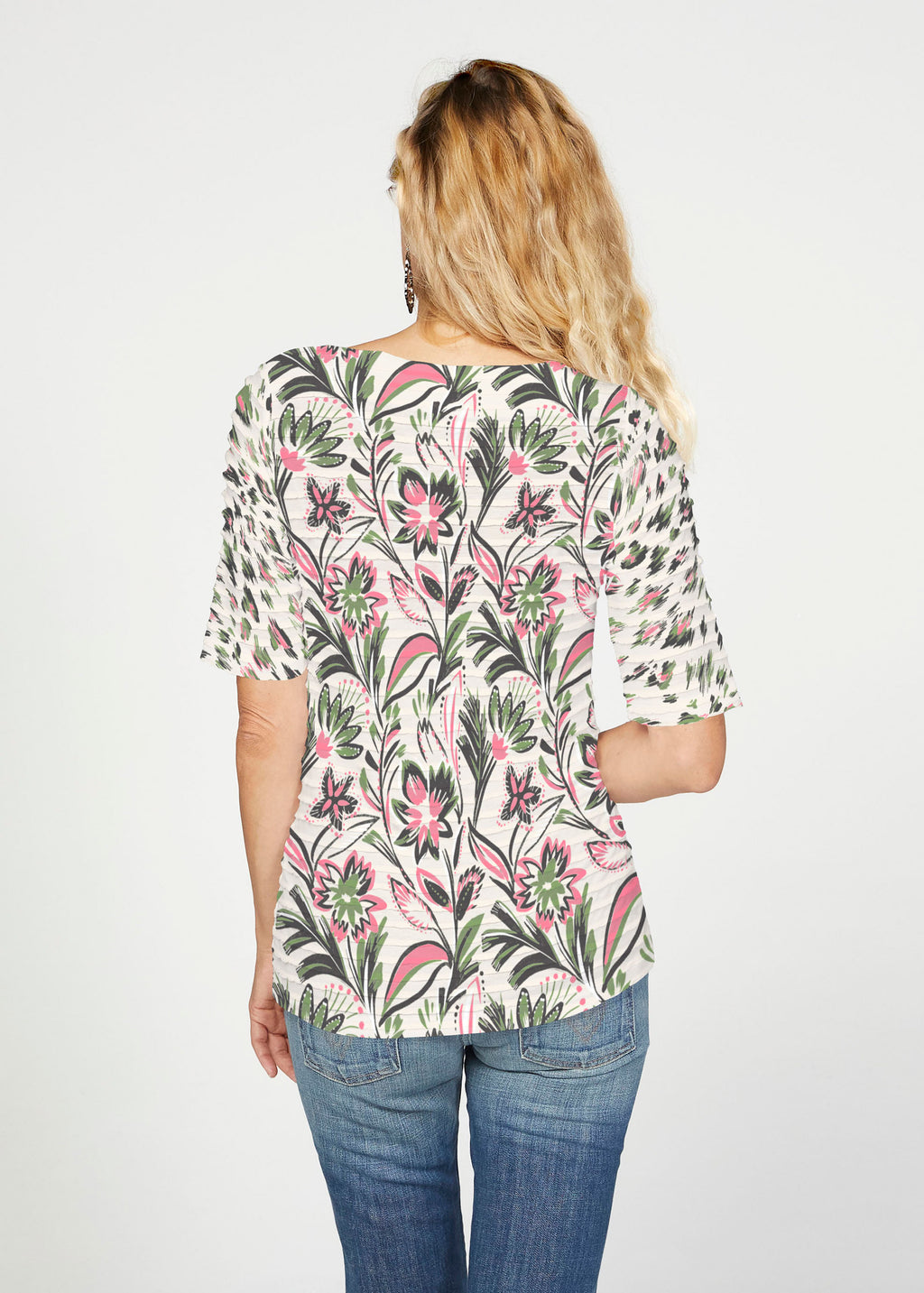 The uniquely soft, pleated texture in this Banded fabric gives the elbow sleeve and boat neck top a fun and sophisticated look. Easy relaxed fit with a hemline that comes below the hip.