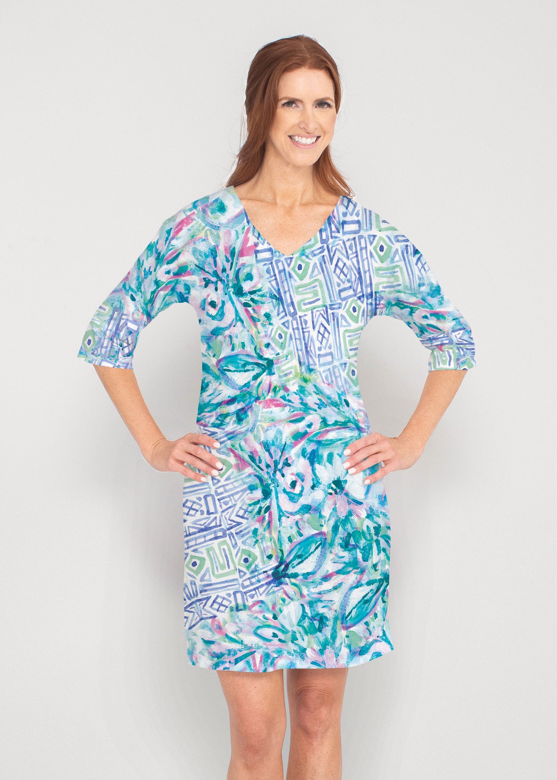 Be comfortable and fashionable all day in our soft Lucy fabric. This v-neck dress features loose 3/4 sleeves, drop shoulders and falls just at the knee.