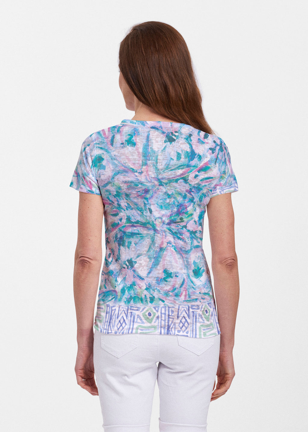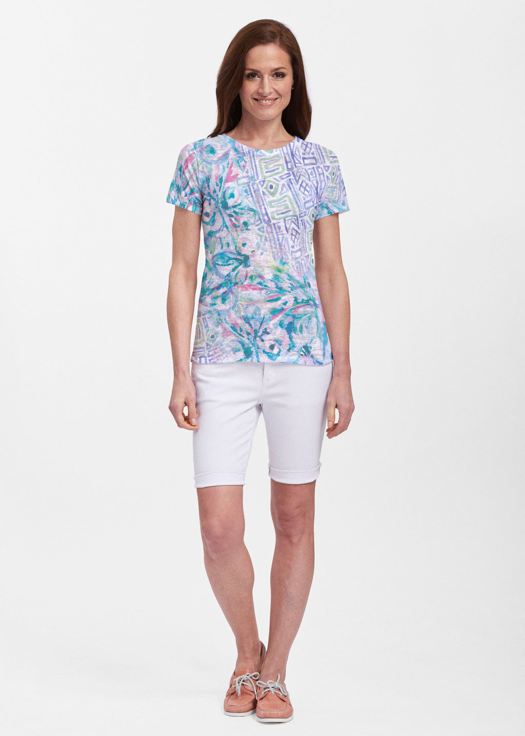 B+A's Sheer burnout fabric provides a fun contemporary look with a more visible burnout texture, that is truly soft to the touch. A nicely fit shirt that falls at the hip, available in both crew and v-neck short sleeves.