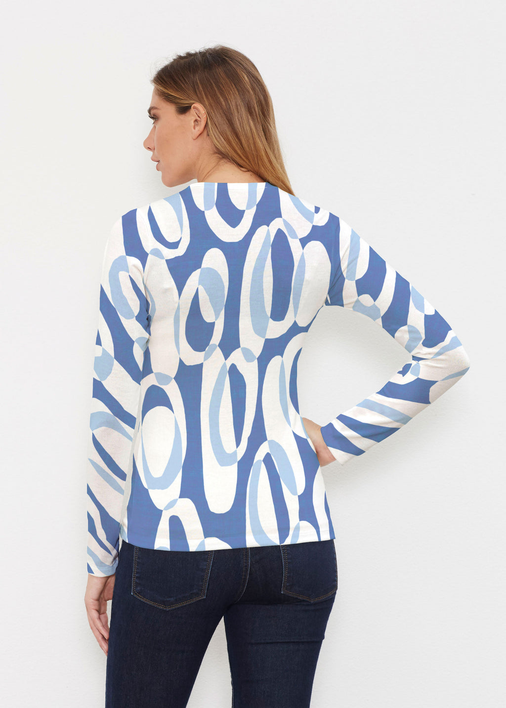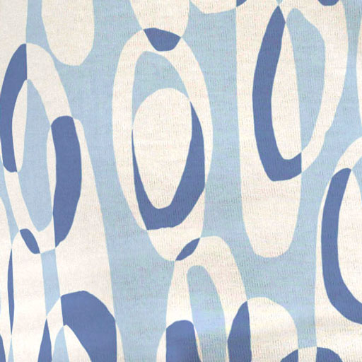 A fun geometrical pattern of overlapping whimsical loops of navy, light blue and white.
