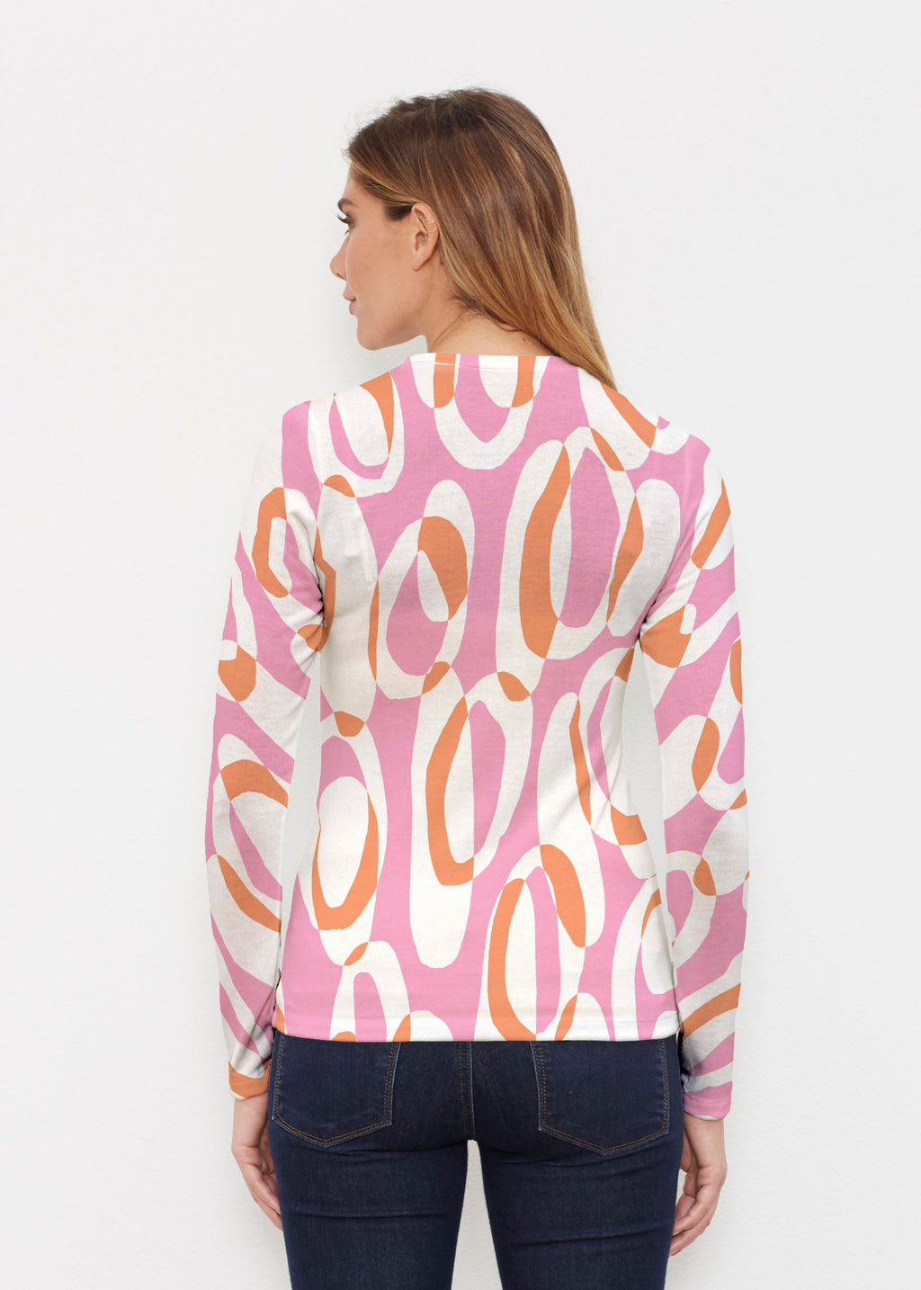 A fun geometrical pattern of overlapping whimsical loops of hot pink, orange and white.