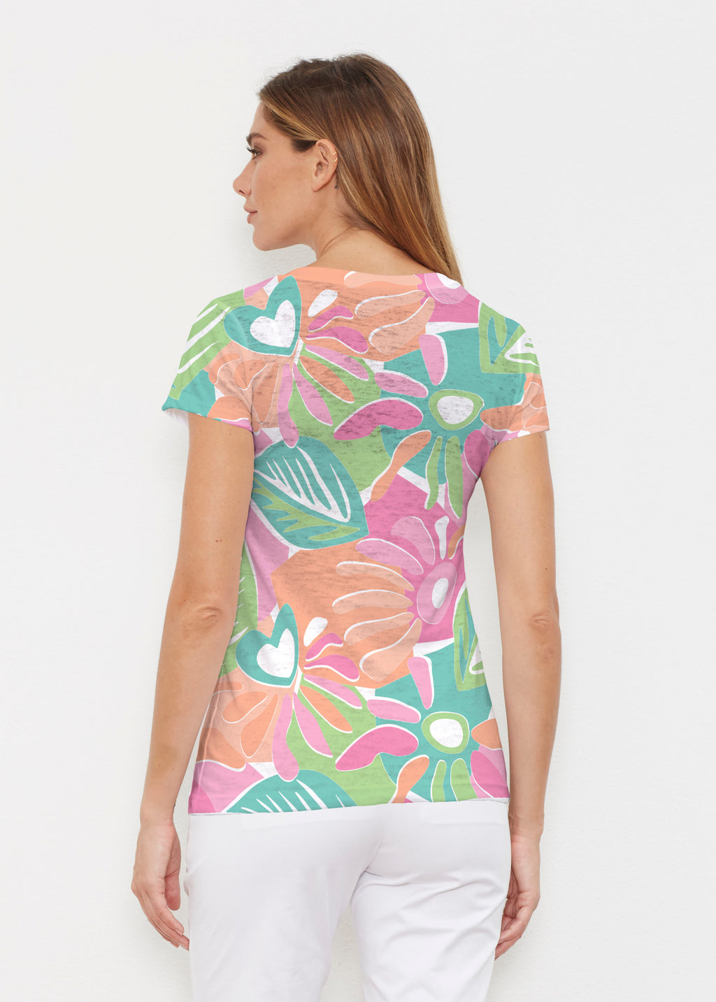 Created in soft, casual burn-out Signature blend, this tee features a subtle v-neck and cap sleeves. -- Your one-of-a-kind garment is created using all-over soft garment sublimation printing. Selected designs are individually printed into your garment. Cotton/Polyester blend.