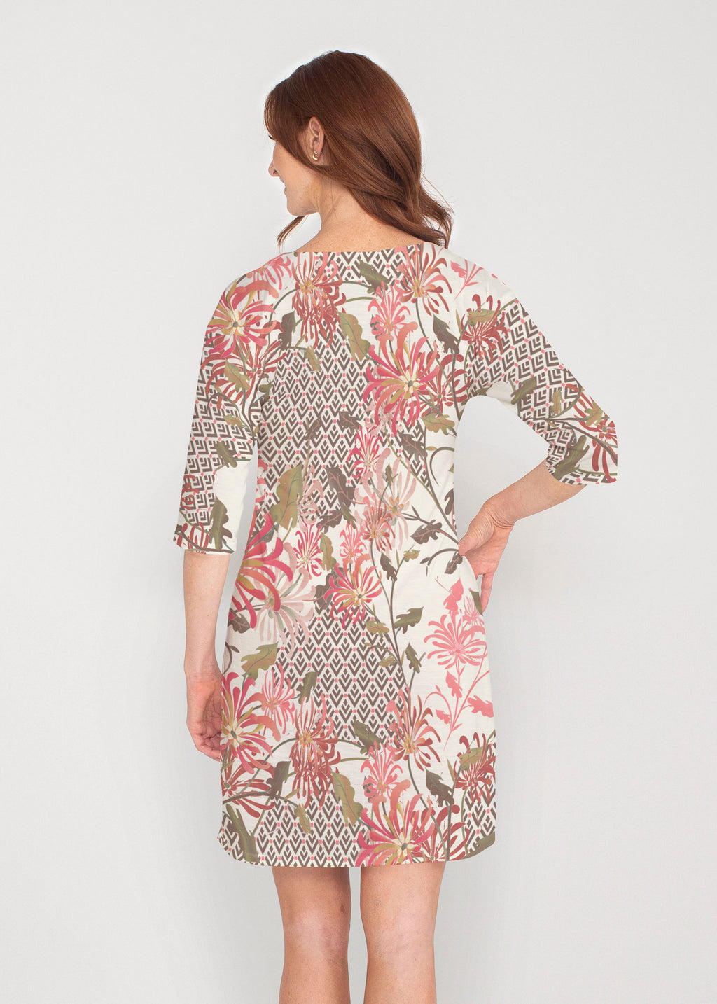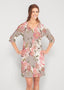 Be comfortable and fashionable all day in our light weight french terry fabric. This v-neck dress features loose 3/4 sleeves, drop shoulders and falls just at the knee.