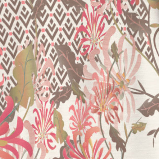 A scattered spring mix of coral, pink & red wildflowers along side a whimsical pattern of chocolate & coral.