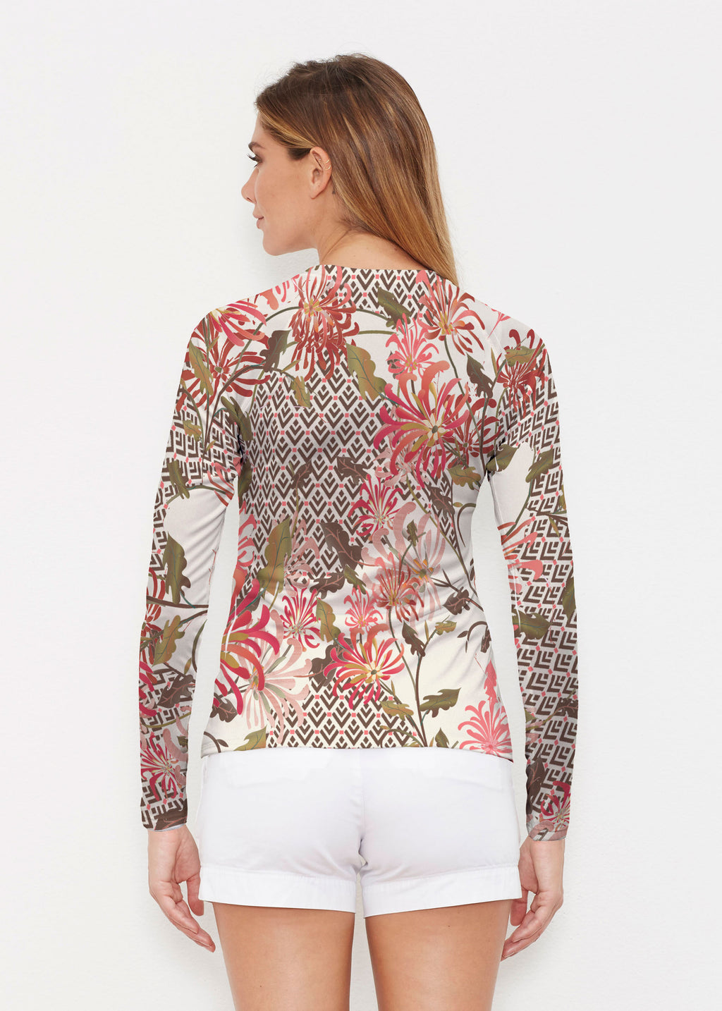 Our WHIMSY ROSE™ Safe Sun UPF 50+ long sleeve, crew neck rash guard offers versatile, beach-to-bistro style, supreme comfort, and an activewear fit. Made in a specially designed Safe Sun textile that blocks more harmful rays and provides a smart solution for those who love to swim, surf, kayak, canoe, waterski, boat, or simply relax waterside.