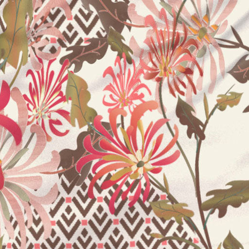 A scattered spring mix of coral, pink & red wildflowers along side a whimsical pattern of chocolate & coral.