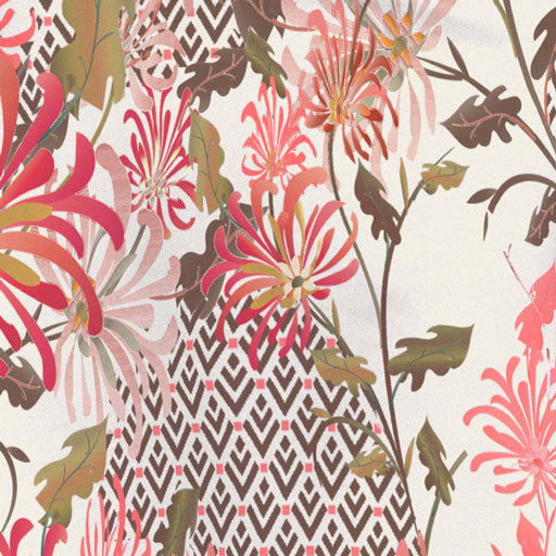 A scattered spring mix of coral, pink & red wildflowers along side a whimsical pattern of chocolate & coral.