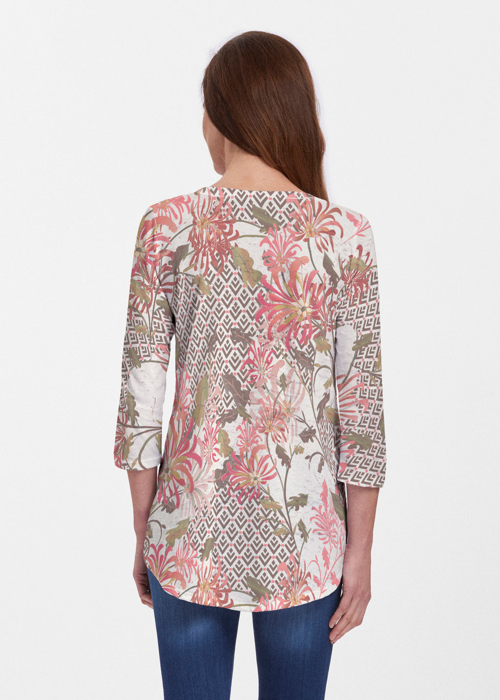 This v-neck tunic in our Signature burnout fabric is forever flattering. 3/4 sleeves and a v-neck flow into a full, swinging shirttail hem.