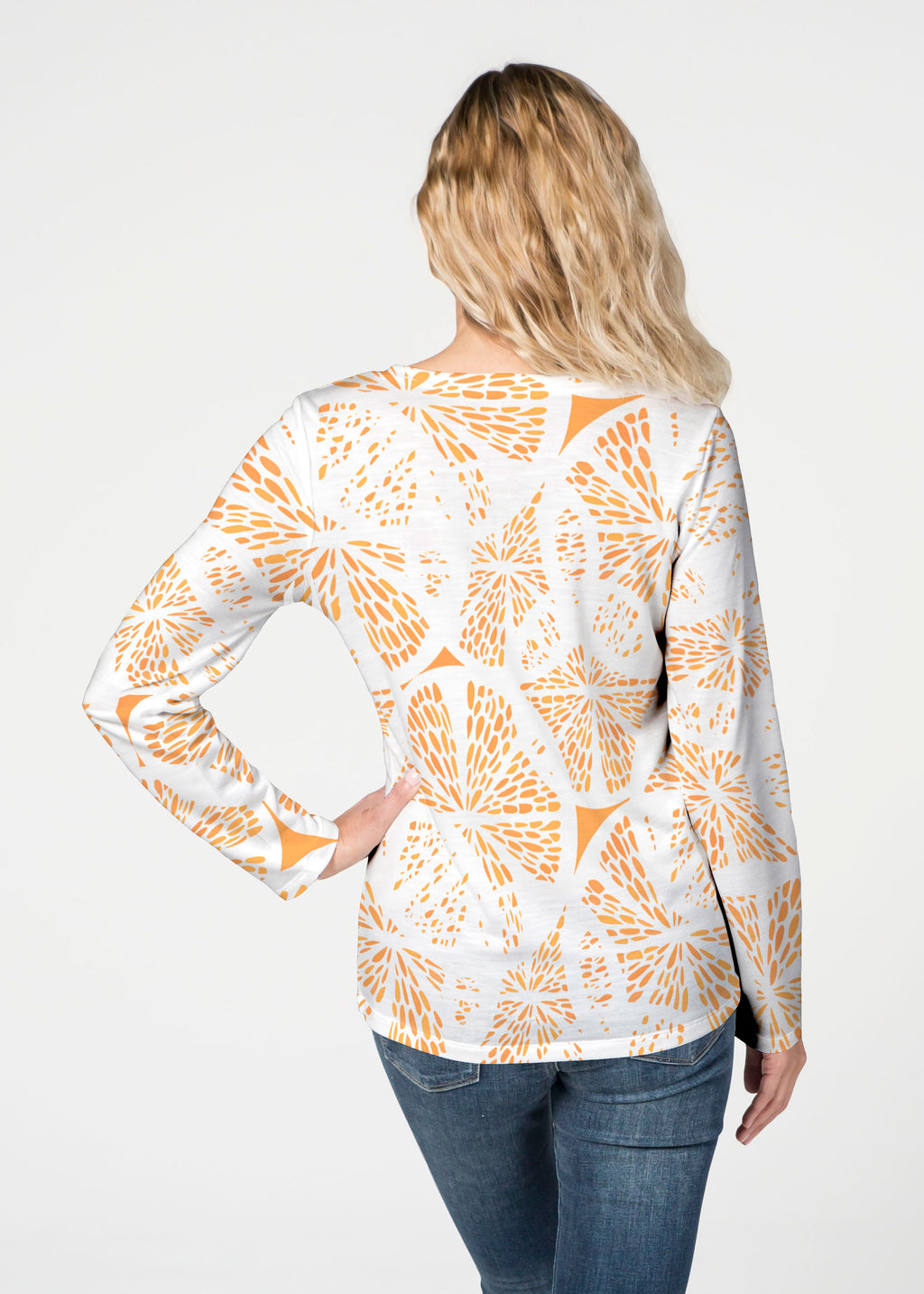 A fun citrus stamped print in orange and white, designed by Susan Werner.