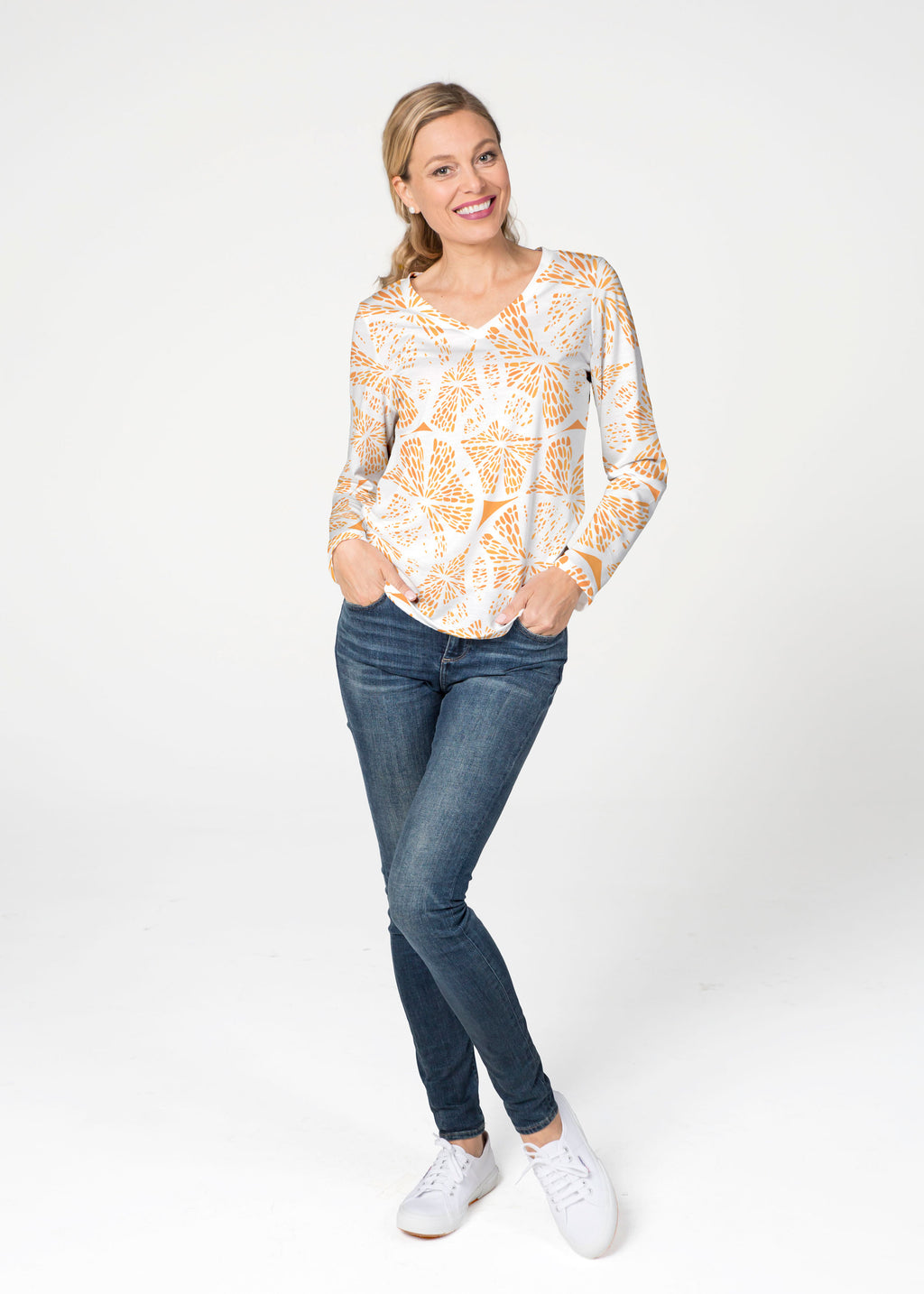 Our French Terry top is comfort and style all in one! Our French Terry top that features long sleeves, a V-neck and a more fitted silhouette that looks stylish in any print.
