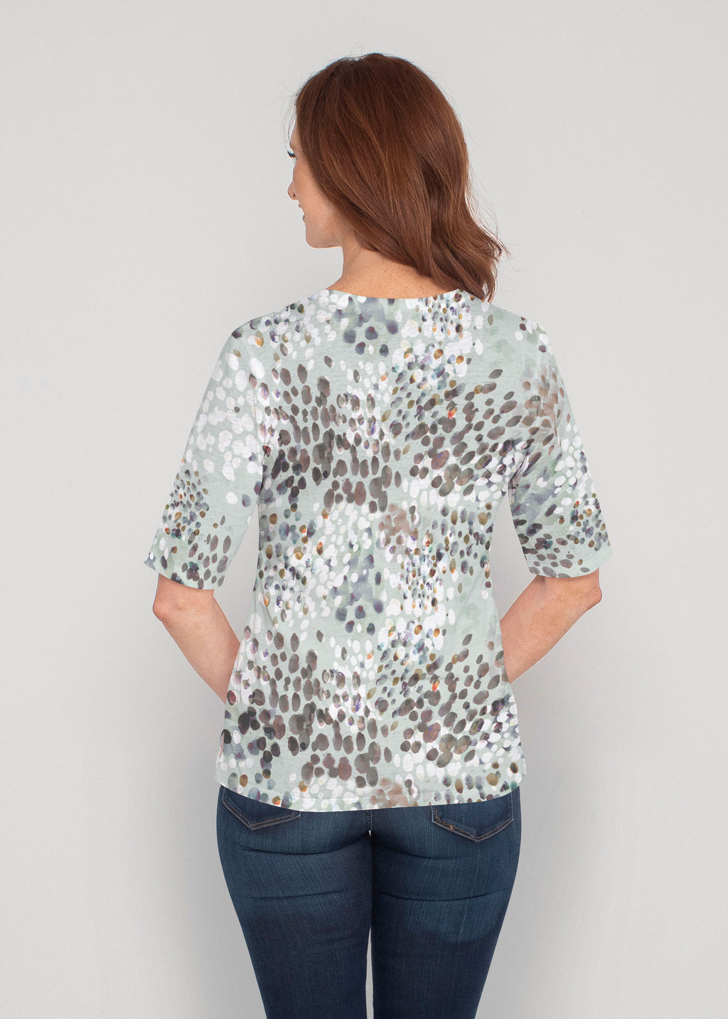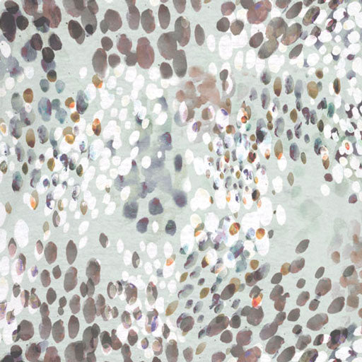 Delicate hand painted dots in shades of browns and whites on a soft mint canvas by Susan Werner.