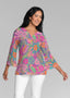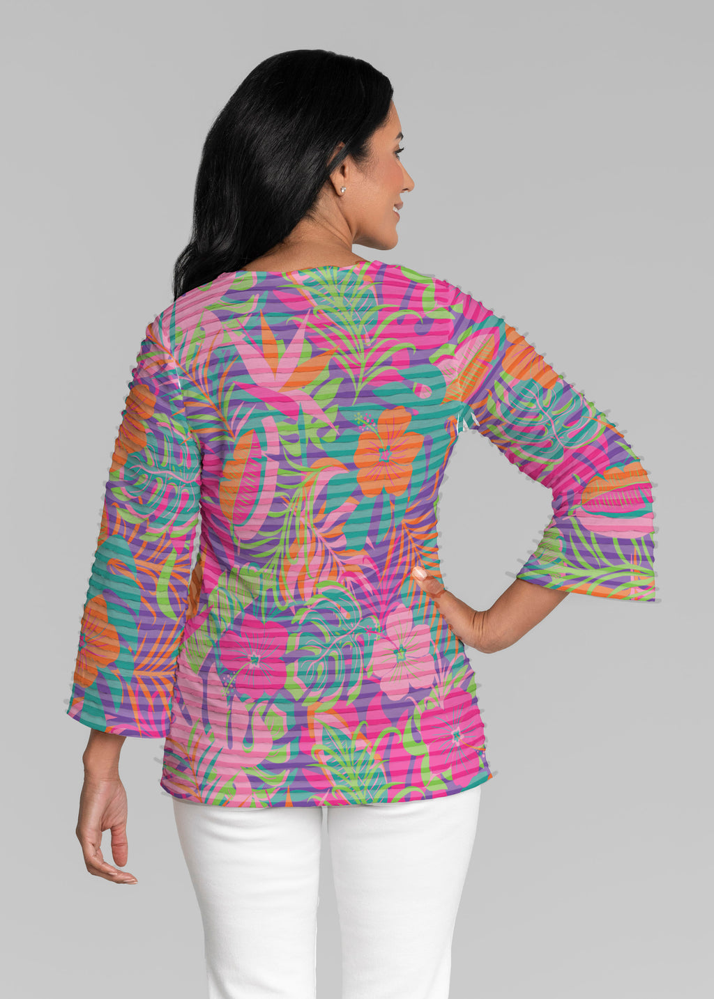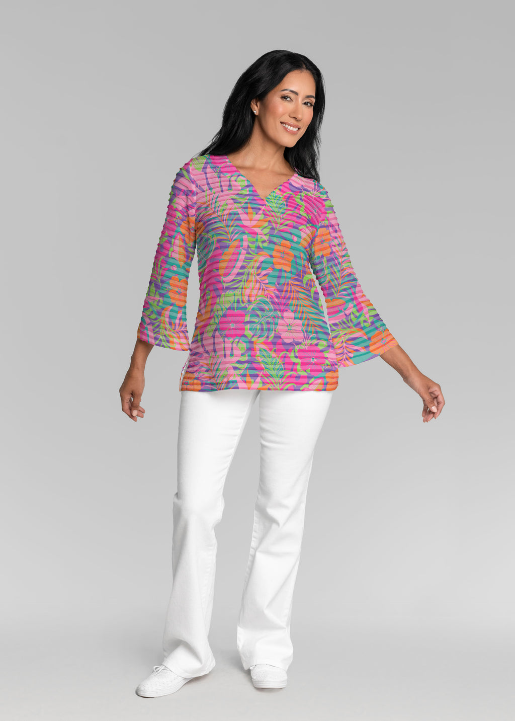 Rainbow Monstera (26040) ~ Banded 3/4 Bell-Sleeve V-Neck Tunic