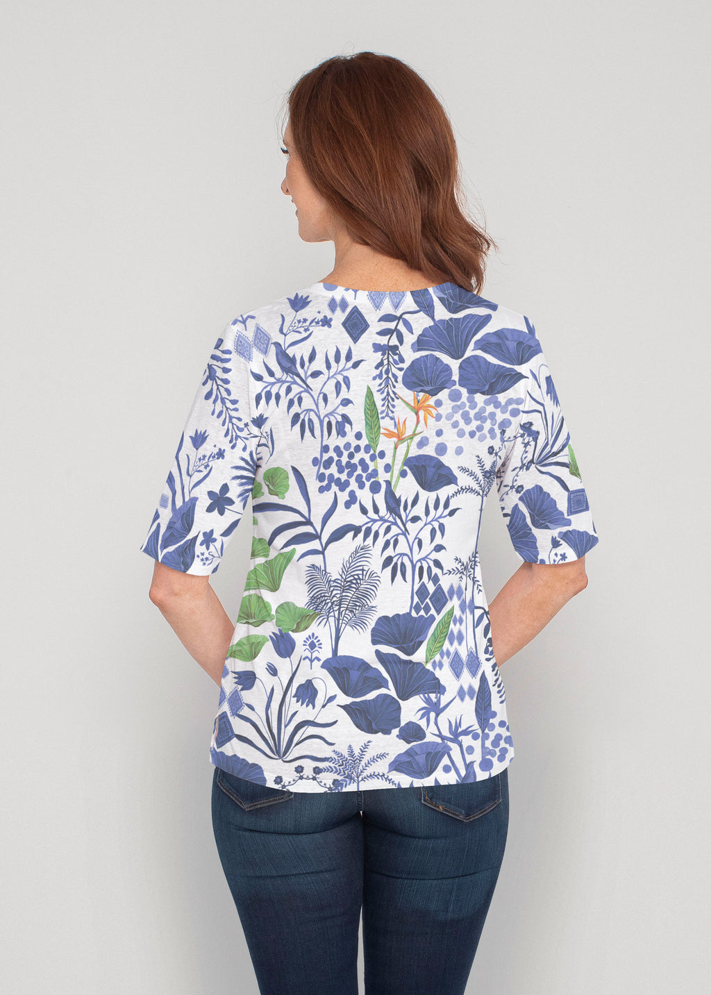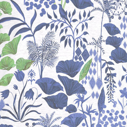 Print design is reminiscent of a beautiful floral garden, featuring bold blue flowers against a clean white canvas, with just a dash of orange to add a pop of color for a a playful and energetic element making a stylish garden party statement.
