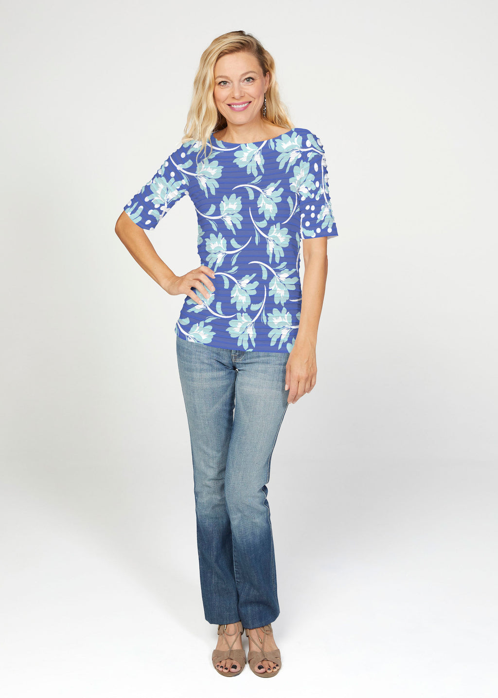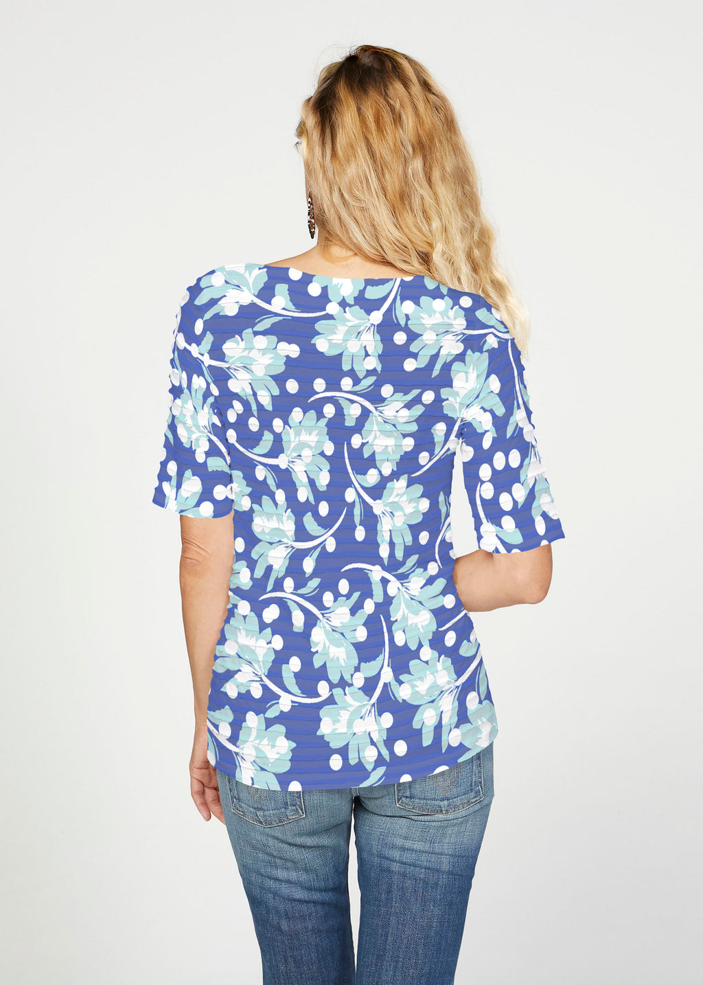 The uniquely soft, pleated texture in this Banded fabric gives the elbow sleeve and boat neck top a fun and sophisticated look. Easy relaxed fit with a hemline that comes below the hip.