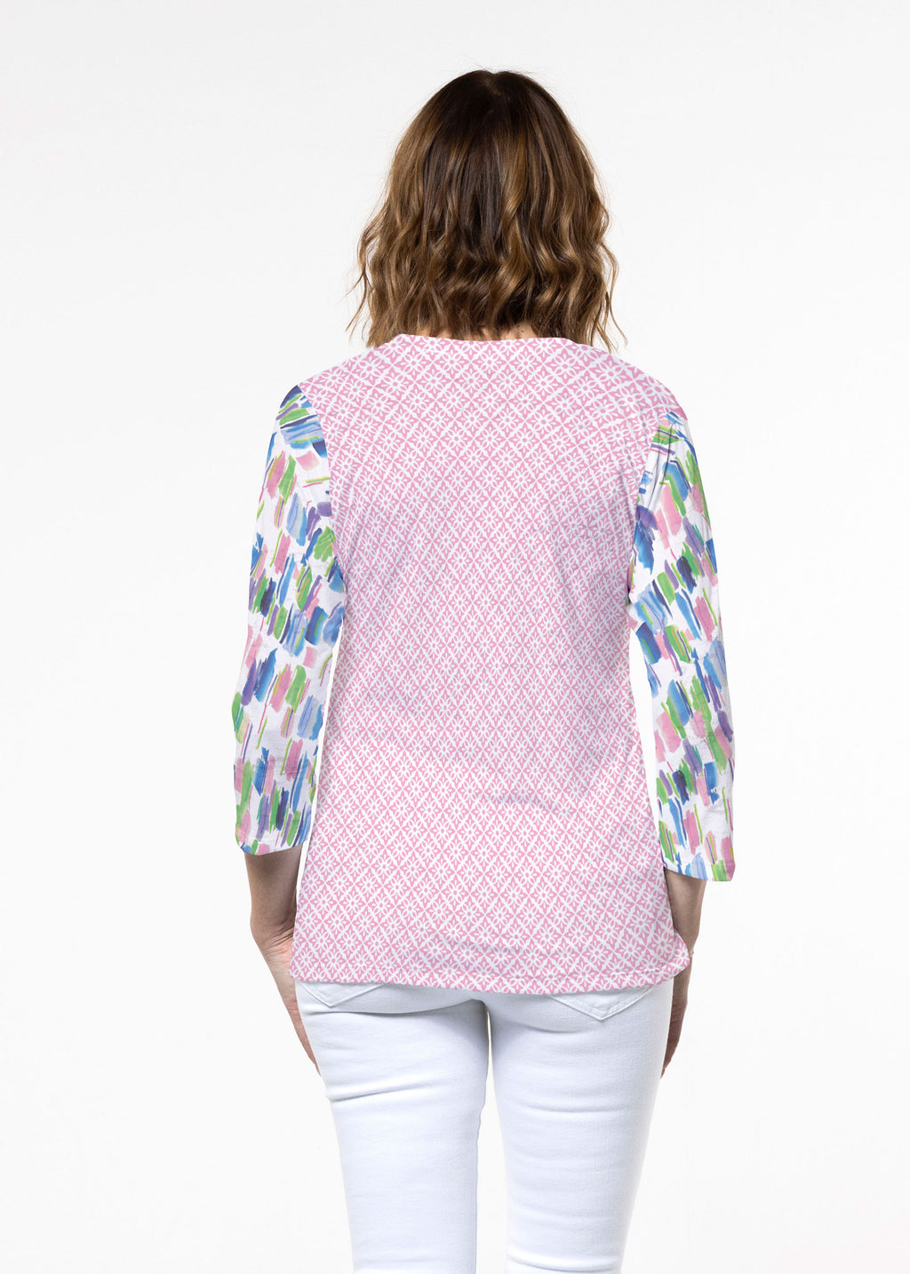 An artist's palette of rich blues, purples, greens and pinks with a geo surprise of taffy pink and white on the back.