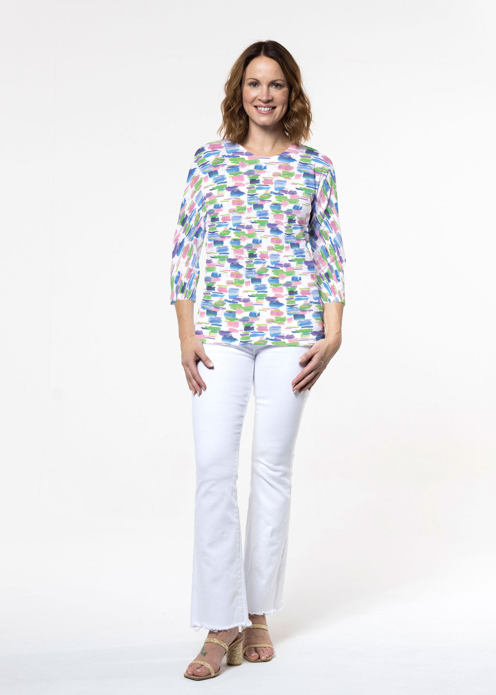 Flattering Signature fabric 3/4 sleeves and a crew neck are perfectly proportioned and more of a relaxed fit.