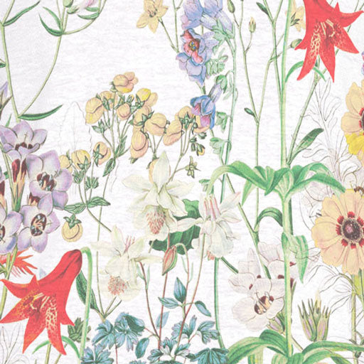 This painterly floral print incorporates a splendid array of multi-colored prairie flowers offset against a clean white backdrop. Designed by Susan Werner.