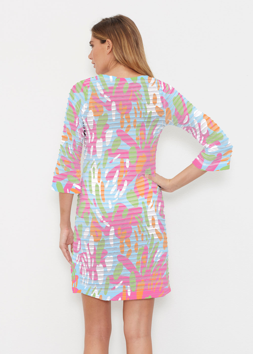 A sweetheart v-neckline and the soft, pleated texture of our Banded fabric make this piece unique. A forgiving fit, side vents, and 3/4 bell sleeves combine for a flattering look. The hemline falls above knee - just a bit shorter than our Classic dresses. --Your one-of-a-kind garment is created using all-over soft garment sublimation printing. Selected designs are individually printed into your garment. Polyester/Rayon blend.