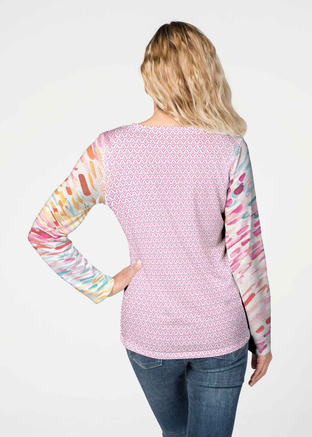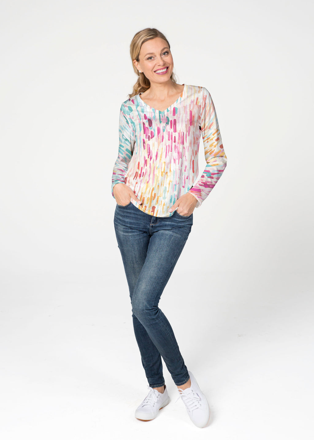 Our French Terry top is comfort and style all in one! Our French Terry top that features long sleeves, a V-neck and a more fitted silhouette that looks stylish in any print.