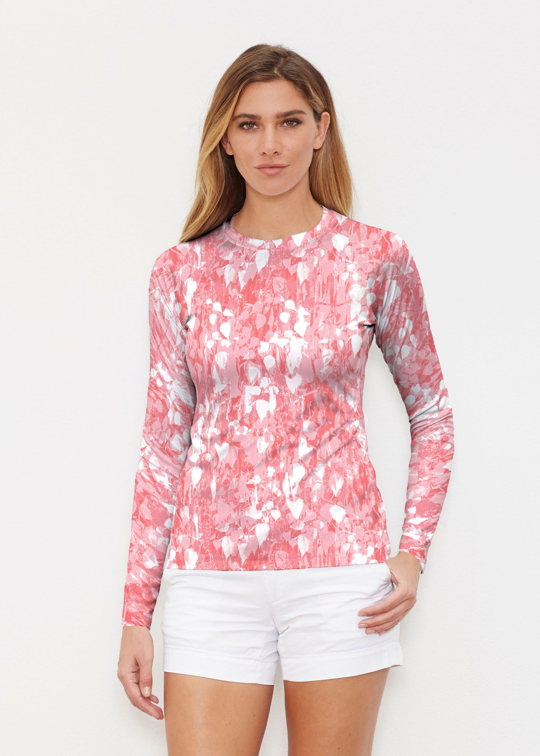 Our WHIMSY ROSE™ Safe Sun UPF 50+ long sleeve, crew neck rash guard offers versatile, beach-to-bistro style, supreme comfort, and an activewear fit. Made in a specially designed Safe Sun textile that blocks more harmful rays and provides a smart solution for those who love to swim, surf, kayak, canoe, waterski, boat, or simply relax waterside.