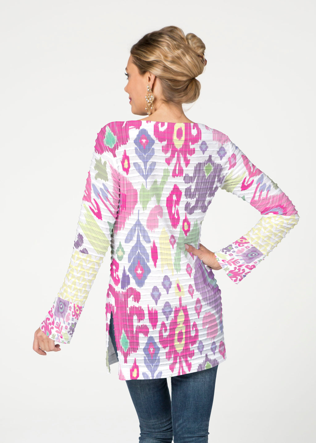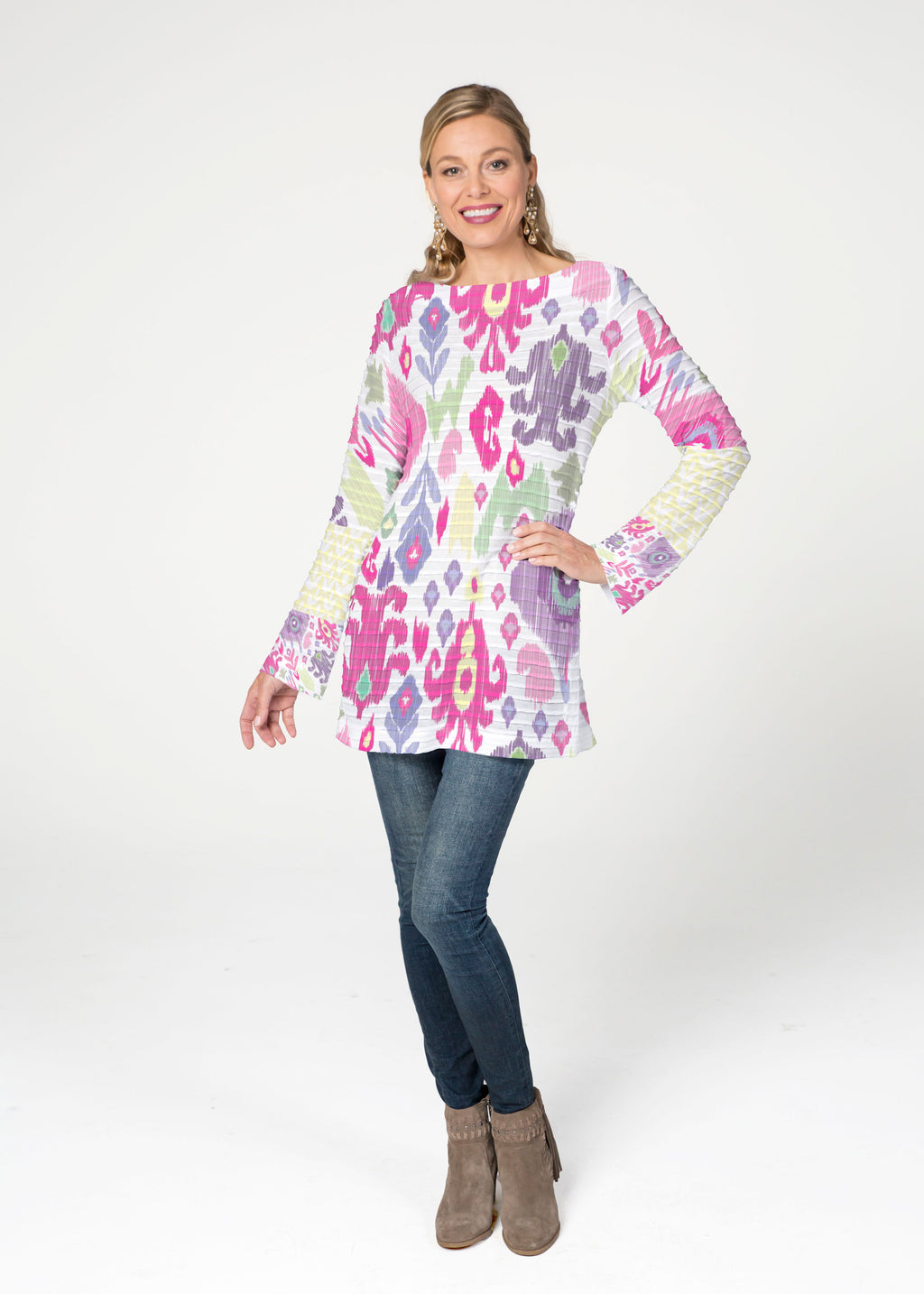 The Banded Boatneck Tunic has the soft pleated texture of our Banded fabric, making this a sophisticated, casual year round piece. A forgiving fit, side vents, with a relaxed full length sleeve combine for a flattering look. The hemline flows gently over the hip.