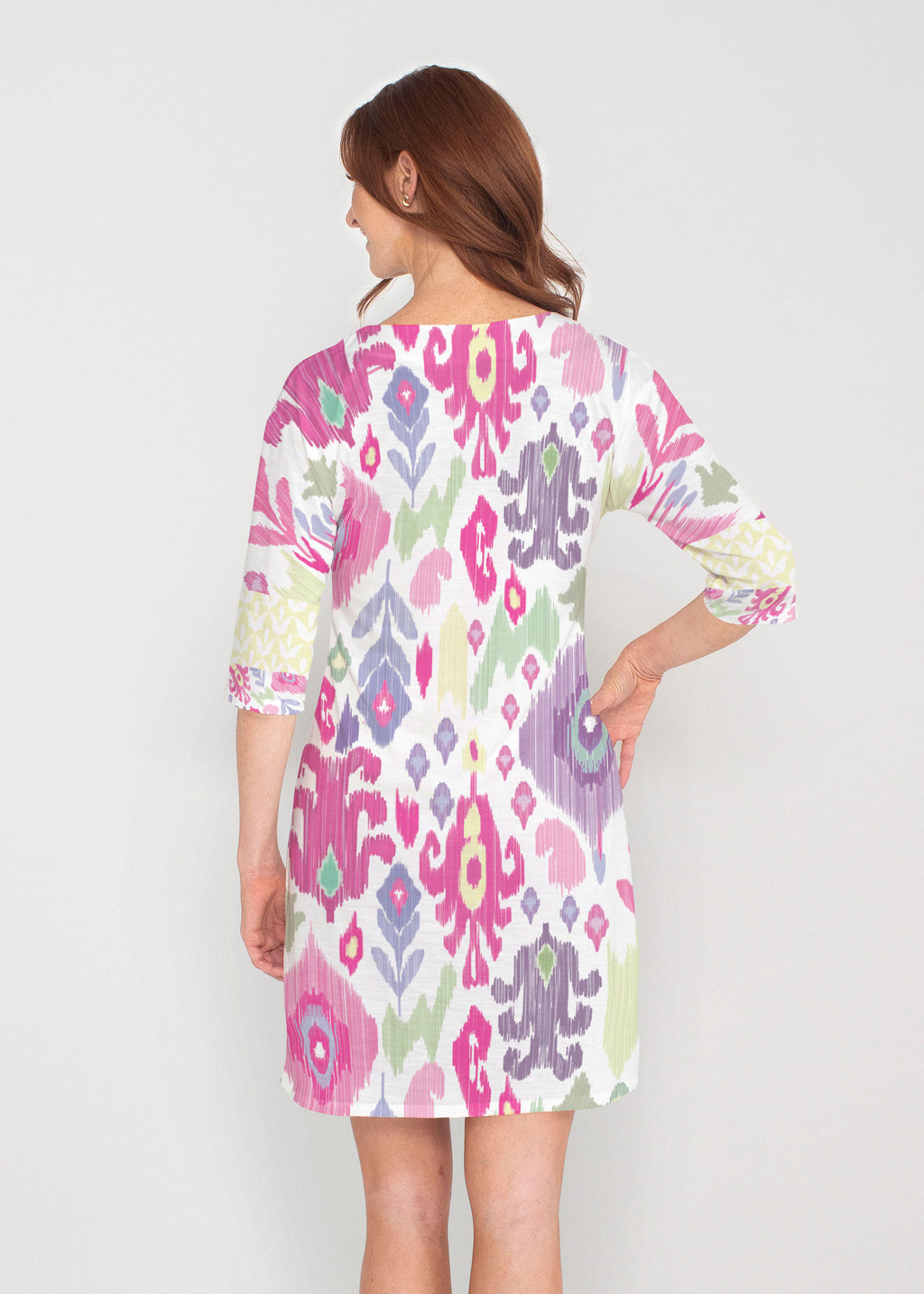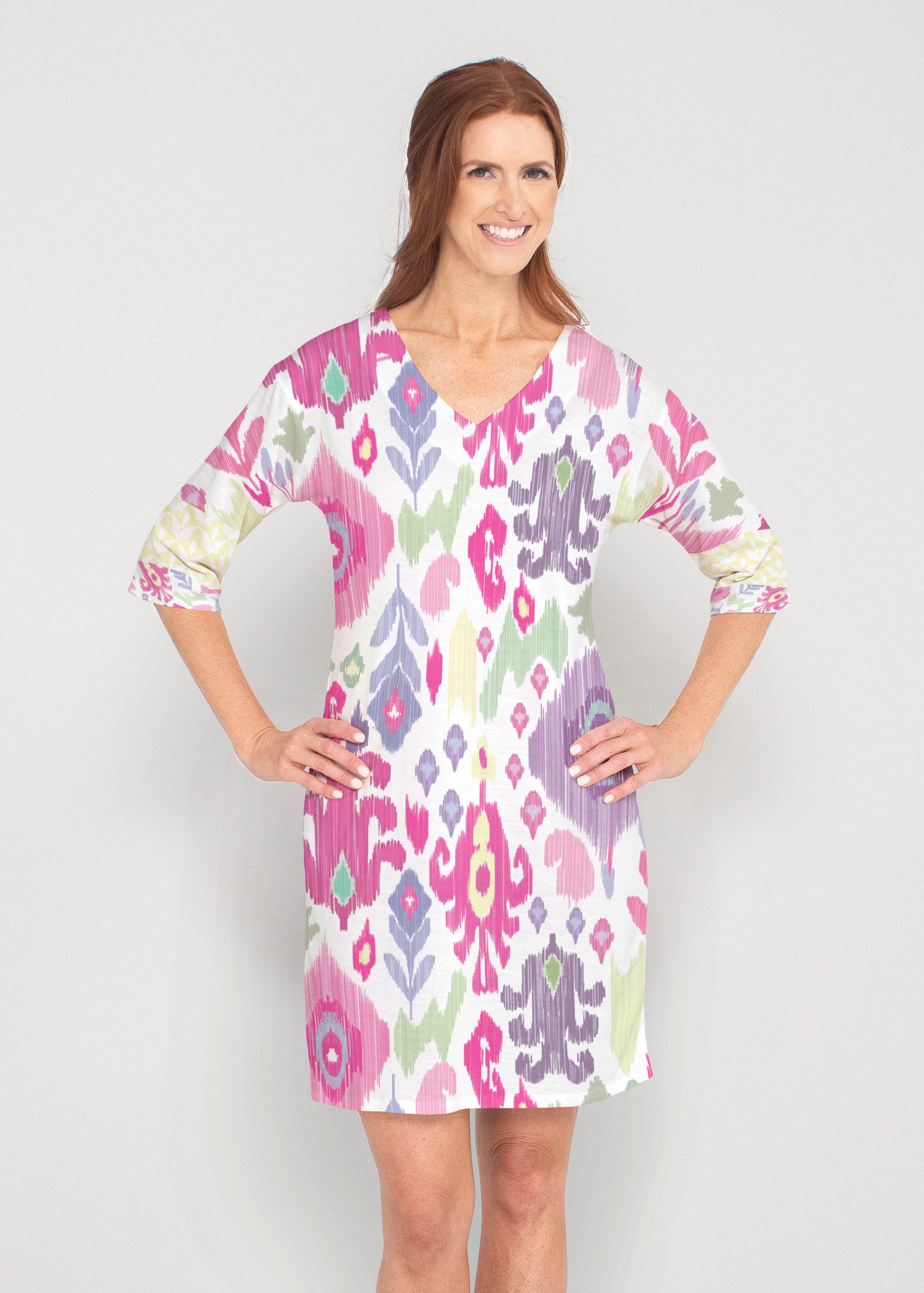 Be comfortable and fashionable all day in our light weight french terry fabric. This v-neck dress features loose 3/4 sleeves, drop shoulders and falls just at the knee.