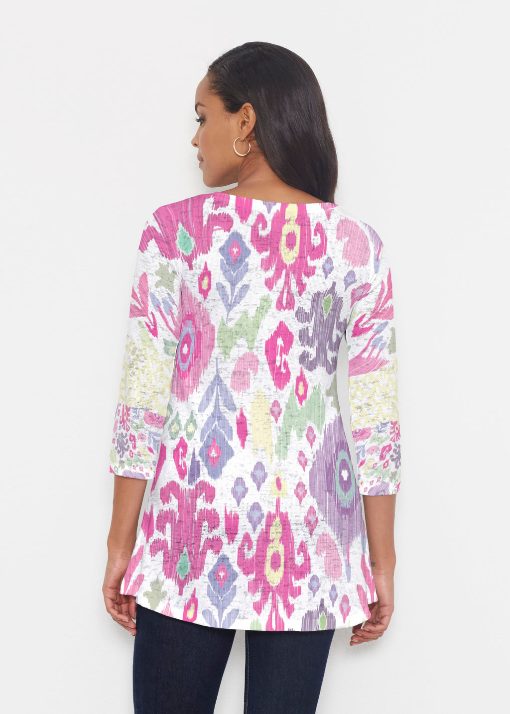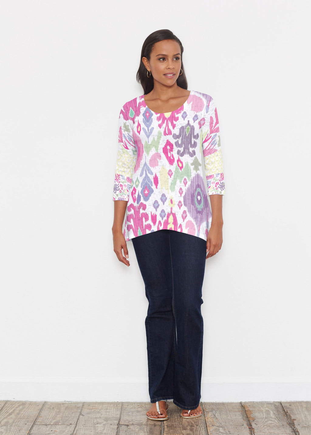 An elegant fit, the hemline falls higher in front then cascades beautifully down across back. Delicate scoop neckline and 3/4 sleeves made in our soft Baby Waffle burnout thermal blend.