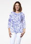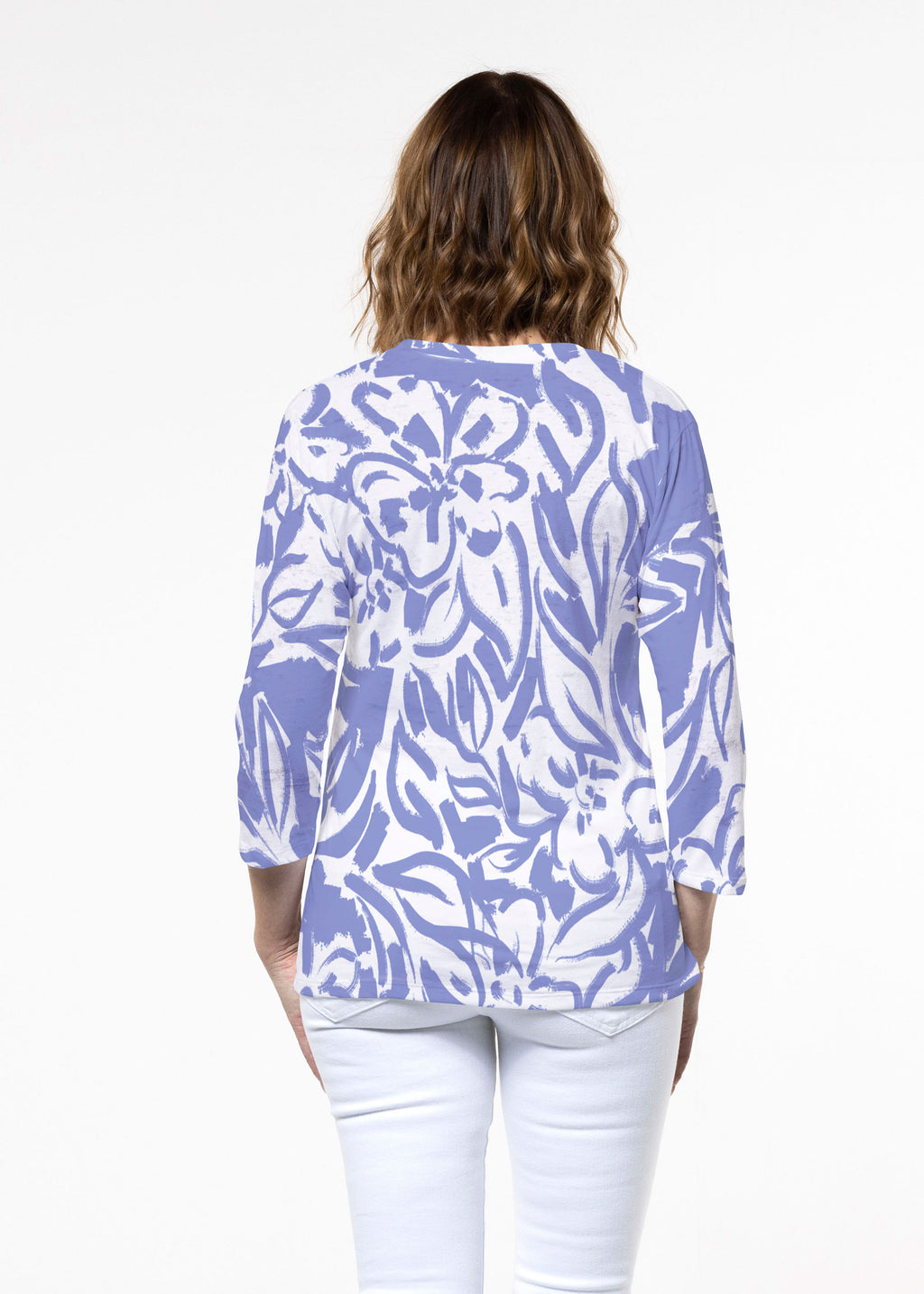 A clean and refreshing print design featuring a blue on white artisanal stencil print. This design captures the essence of summer with a delicate and airy portrayal of periwinkle flowers in a floral pattern.