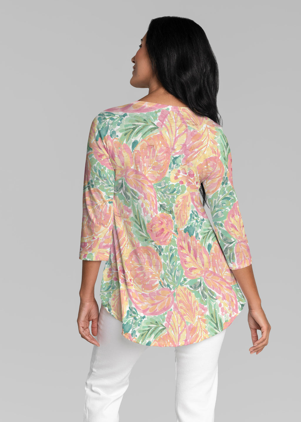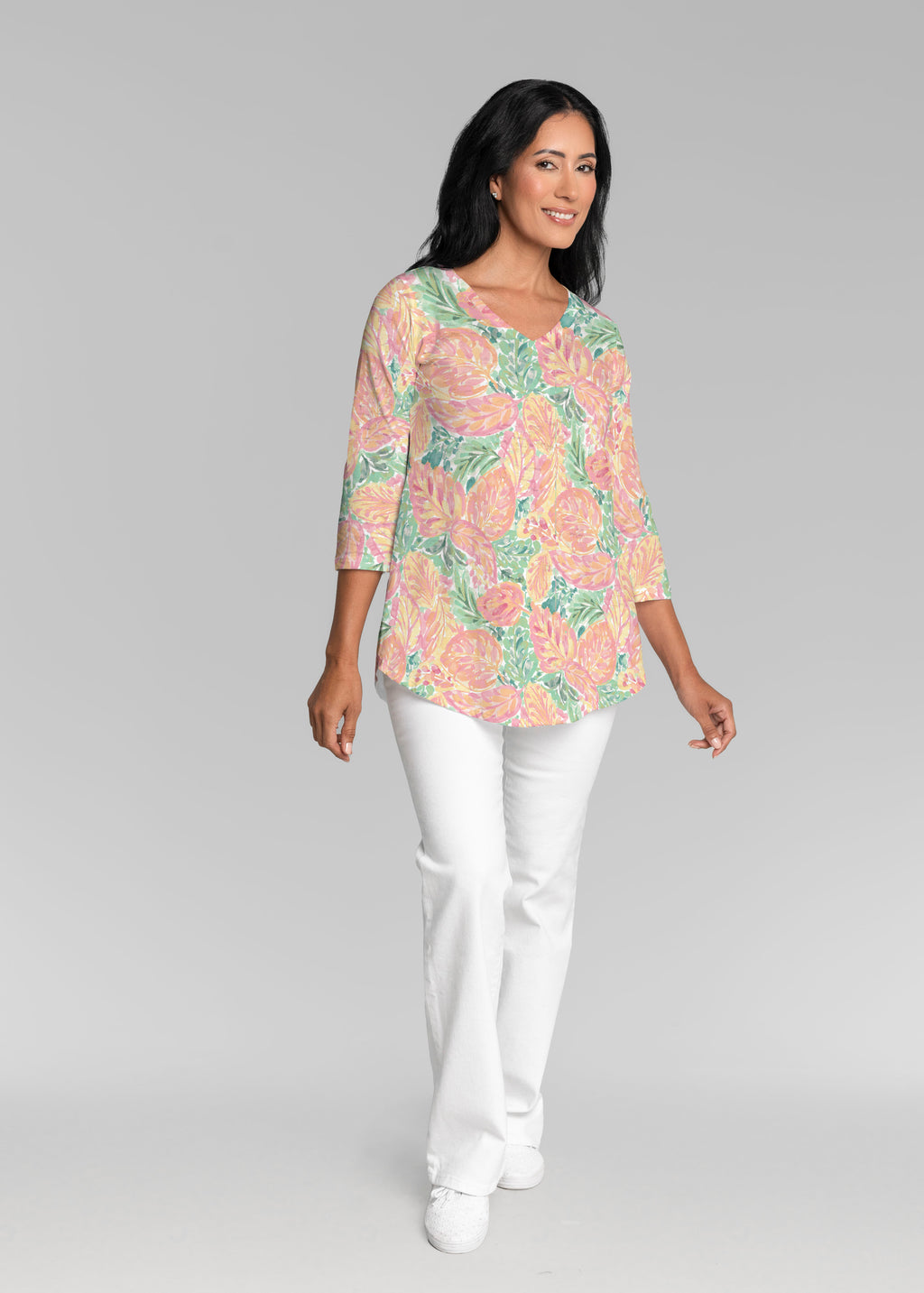 This v-neck tunic in our Signature burnout fabric is forever flattering. 3/4 sleeves and a v-neck flow into a full, swinging shirttail hem.
