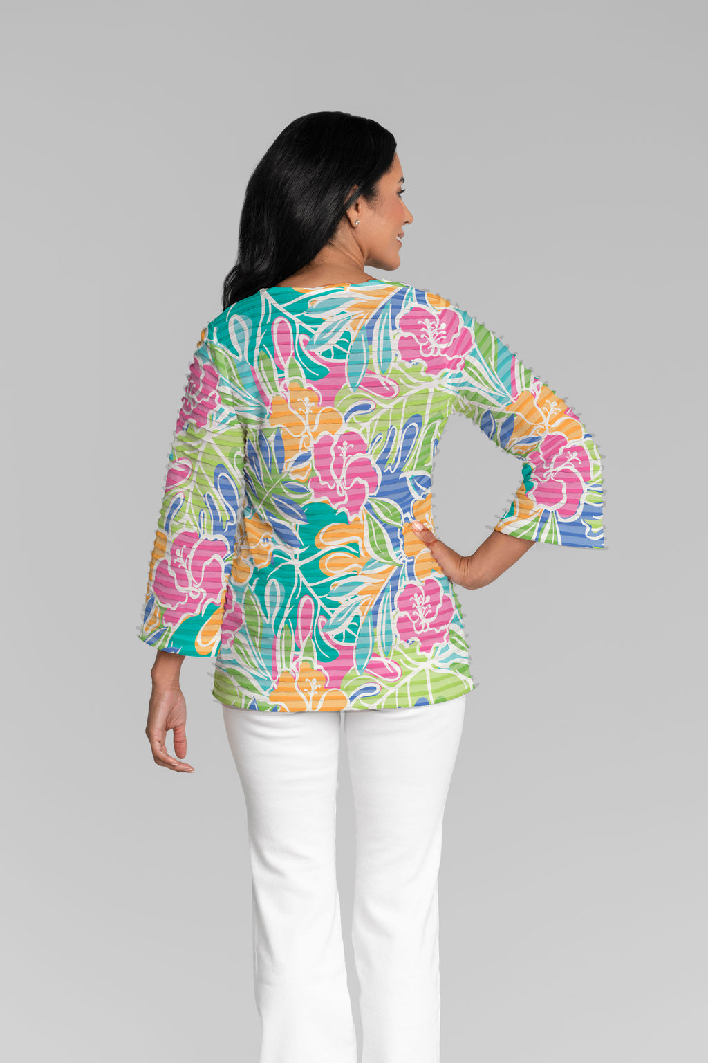 The uniquely soft, pleated texture in this Banded fabric give the 3/4 bell sleeves and sweetheart v-neck a fun and sophisticated look. Flattering side vents adorn the hemline that skims the hip.