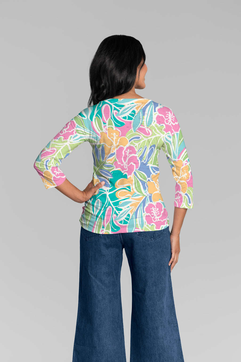 Our casual Signature 3/4 sleeve has a subtle v-neck and is perfectly proportioned and a new best-selling favorite. This relaxed fit is not only flattering but you get to pick that special print for any mood.