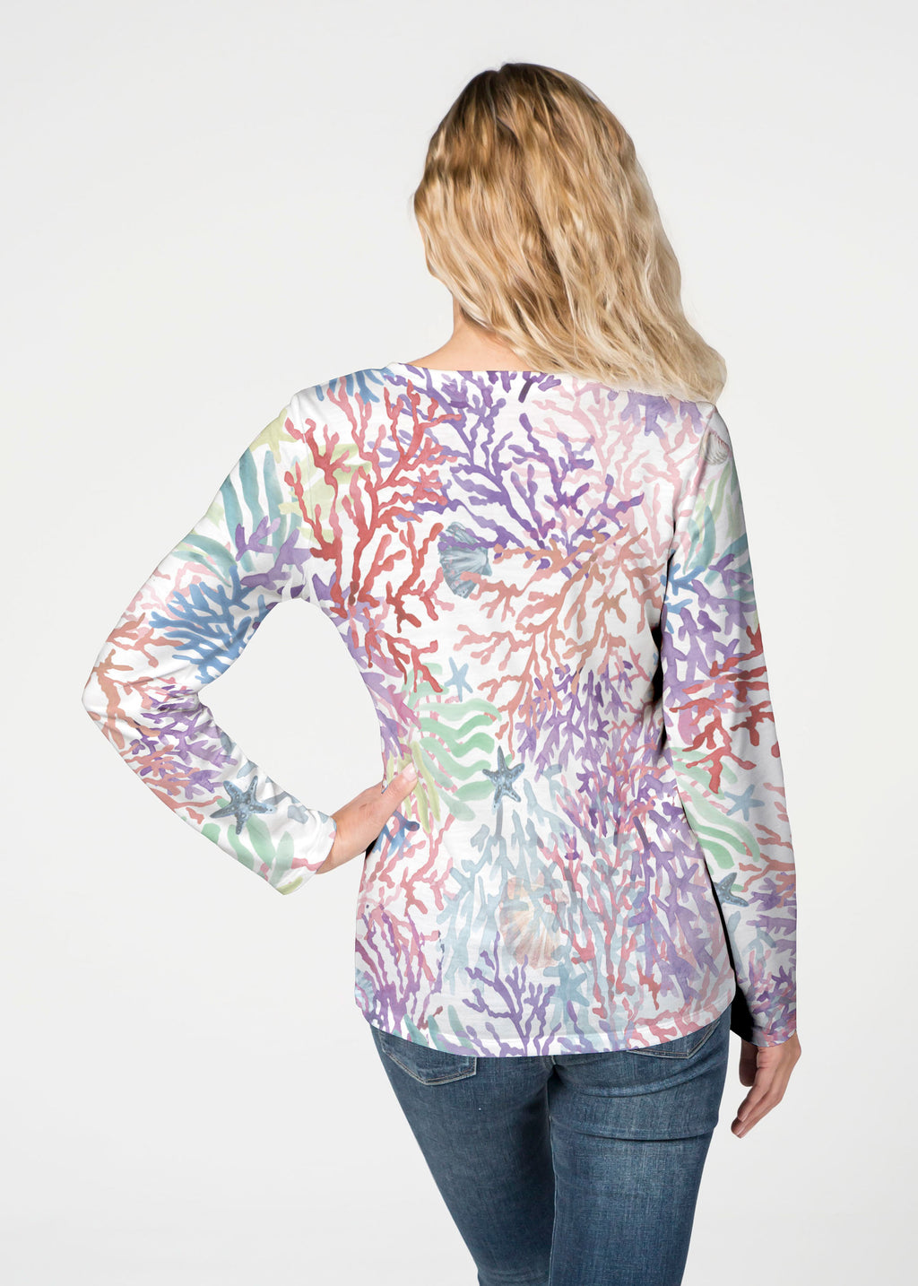 A white canvas of tropic coral in gorgeous shades of aqua, green, pink and purple.