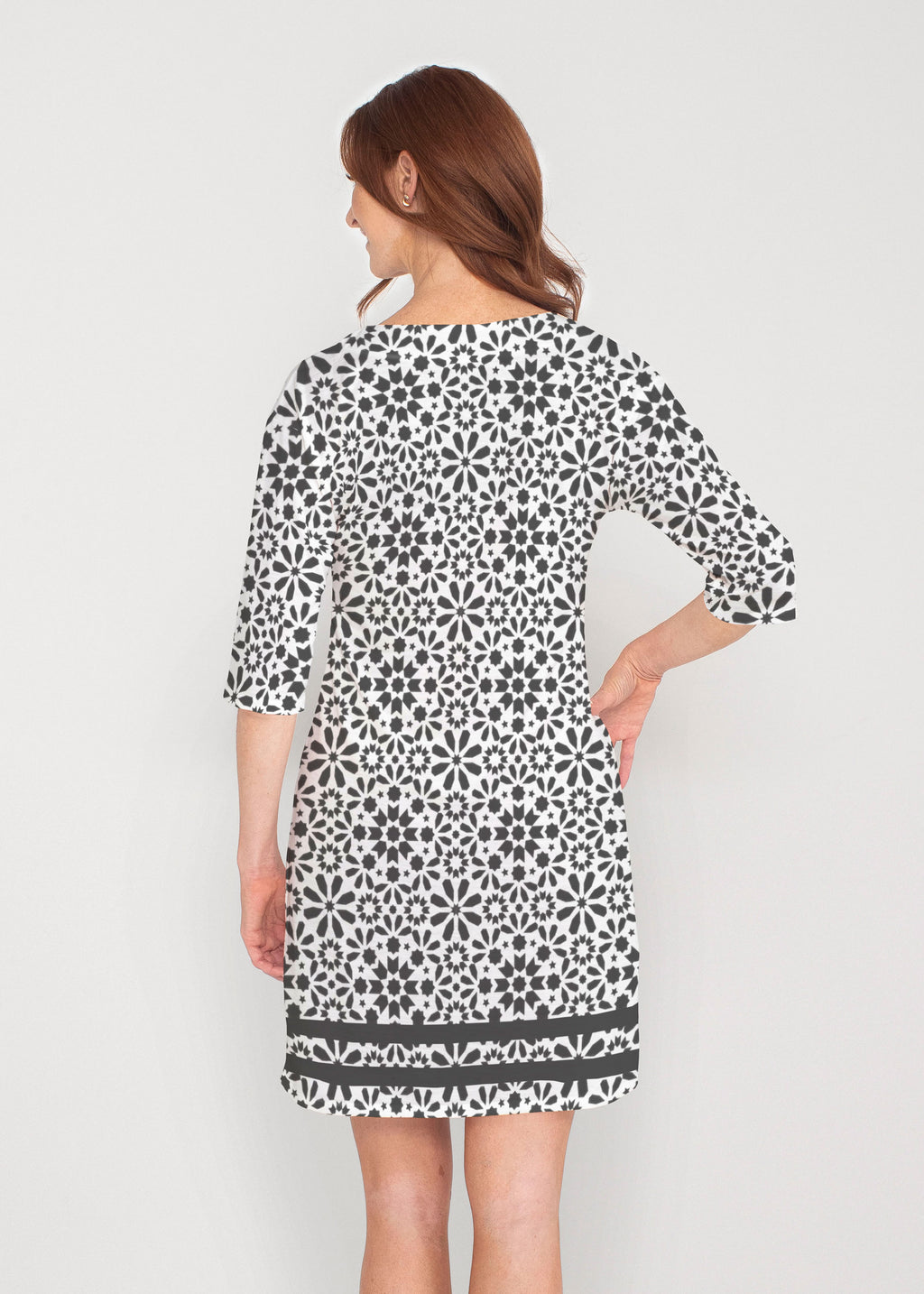 Be comfortable and fashionable all day in our light weight french terry fabric. This v-neck dress features loose 3/4 sleeves, drop shoulders and falls just at the knee.