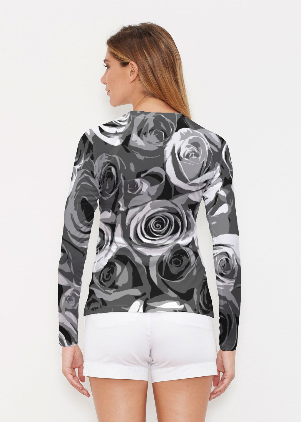 Our WHIMSY ROSE™ Safe Sun UPF 50+ long sleeve, crew neck rash guard offers versatile, beach-to-bistro style, supreme comfort, and an activewear fit. Made in a specially designed Safe Sun textile that blocks more harmful rays and provides a smart solution for those who love to swim, surf, kayak, canoe, waterski, boat, or simply relax waterside.